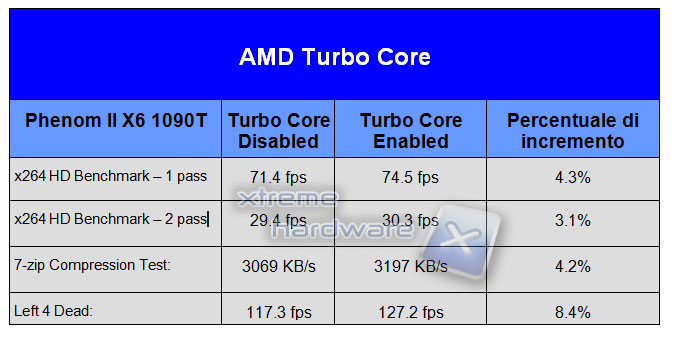 Vediamo nella tabella di seguito, i benefici in termini % che apporta l’uso della tecnologia Turbo Core di AMD.