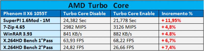 Nella tabella che segue possiamo vedere i benefici prestazionali apportati dall’utilizzo della tecnologia AMD Turbo Core, con il processore AMD Phenom II X6 1055T: