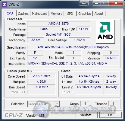 Notiamo che il processore è dotato di quattro core operanti alla frequenza di 3.0 GHz (30 x 100 MHz BUS). Il voltaggio di default è impostato su 1.392V e l’impronta termica massima è pari a 117W. Una cosa che notiamo che CPU-Z non identifica la sigla com K, ma come semplice A8-3870. E' un errore del software che necessita di un piccolo aggiornamento
