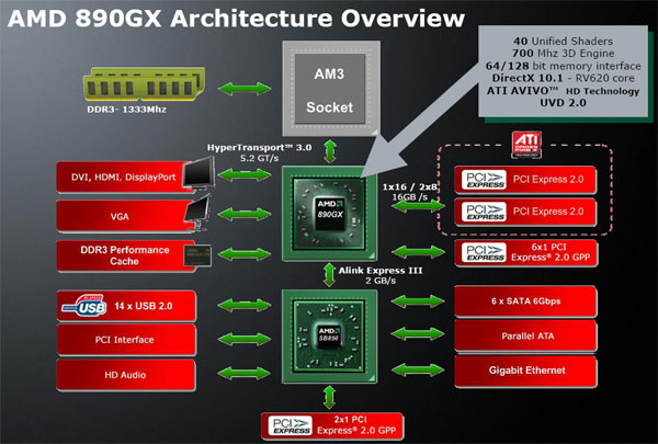 La versione 890GX è costruita, invece, con processo produttivo a 55nm, presenta un controller grafico integrato ed è in grado di gestire fino a 22 linee PCIe. Sono possibili, quindi, configurazioni Multi-GPU CrossFireX fino a un massimo di due VGA in parallelo, ognuna operante con segnale elettrico 8x. Le rimanenti 6 linee PCIe possono essere impiegate, a discrezione del produttore, per gestire altri slot PCIe. E’ supportata inoltre la tecnologia Hybrid CrossFire, grazie alla quale sarà possibile affiancare una GPU discreta alla GPU integrata nel chipset. Quest’ultima appartiene alla famiglia Radeon HD 4200, conta 40 Stream Processor operanti a 700MHz ed è pienamente compatibile con le API DirectX 10.1 e con la tecnologia UVD2.