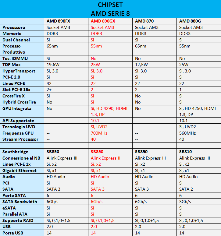 AMD, in contemporanea al lancio dei suoi processori Phenom II X6, ha rinnovato anche la sua famiglia di chipset, introducendo la serie 800. A farne parte vi sono quattro differenti versioni di Northbridge, con e senza grafica integrata (IGP), e due versioni di Southbridge, con e senza supporto al Serial ATA di terza generazione a 6Gb/s. Abbiamo quindi i chipset 890FX e 870, sprovvisti di IGP, e le versioni 890GX e 880G che invece vantano la presenza di una GPU Integrata. Di seguito vi mostriamo una tabella con tutte le caratteristiche principali di questi chipset: