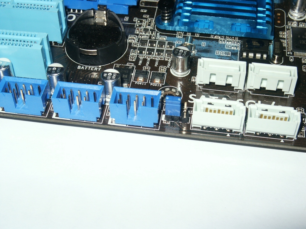 Scendendo verso il basso notiamo la presenza di sei porte Serial ATA, di cui due ruotate a 90°, tutte gestite in modo nativo dal SB850 e con pieno supporto al SATA3 6Gb/s.