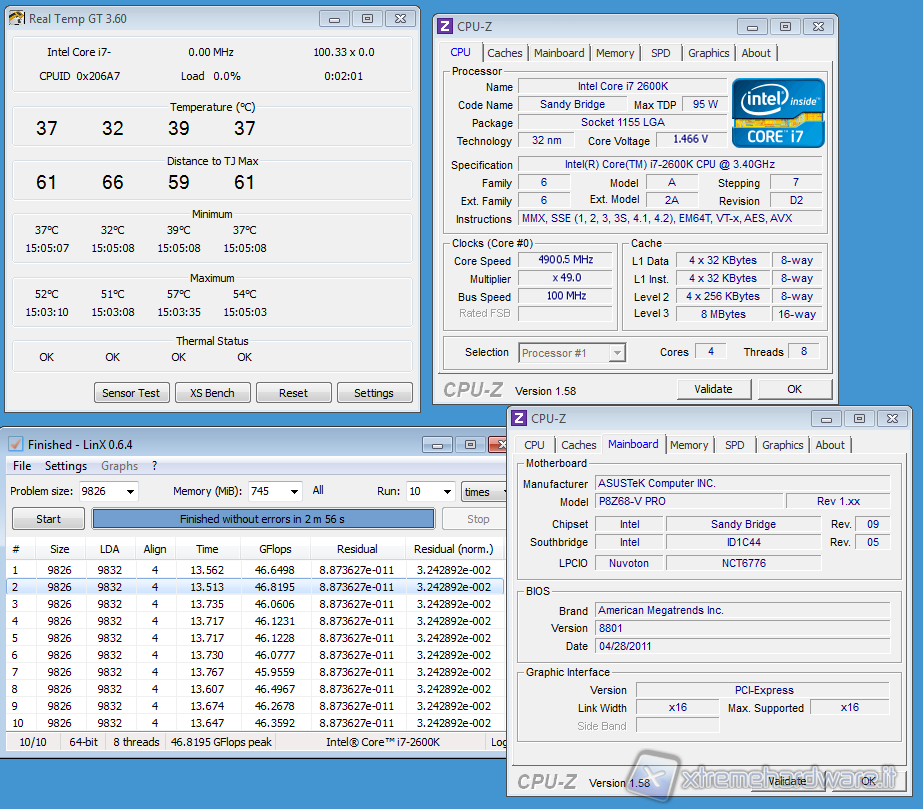 Siamo riusciti ad avviare il sistema con moltiplicatore impostato a 49x e con voltaggio a 1.465 V. Con il BUS lasciato a 100 MHz, la frequenza ottenuta è stata di 4,9 GHz; si tratta di un ottimo risultato. Le temperature ed i consumi della CPU si mantengono su valori non allarmanti nonostante la temperatura ambiente al di sopra della media stagionale . Abbiamo quindi effettuato un piccolo test utilizzando SuperPì 1M.
