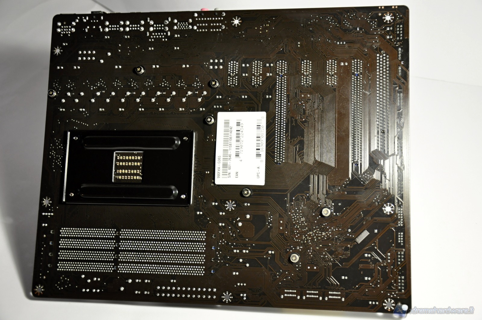 Ecco le foto della parte sottostante. Come vedete la superficie è pulita senza rilievi significativi, fatta eccezione per la staffa di ritenzione del socketla quale non è incollata ma fissata con delle viti. Questo agevola e facilita le operazioni di coibentazione tramite neoprene quando si vogliono eseguire i test di overclock spinto, ricorrendo all’azoto.
