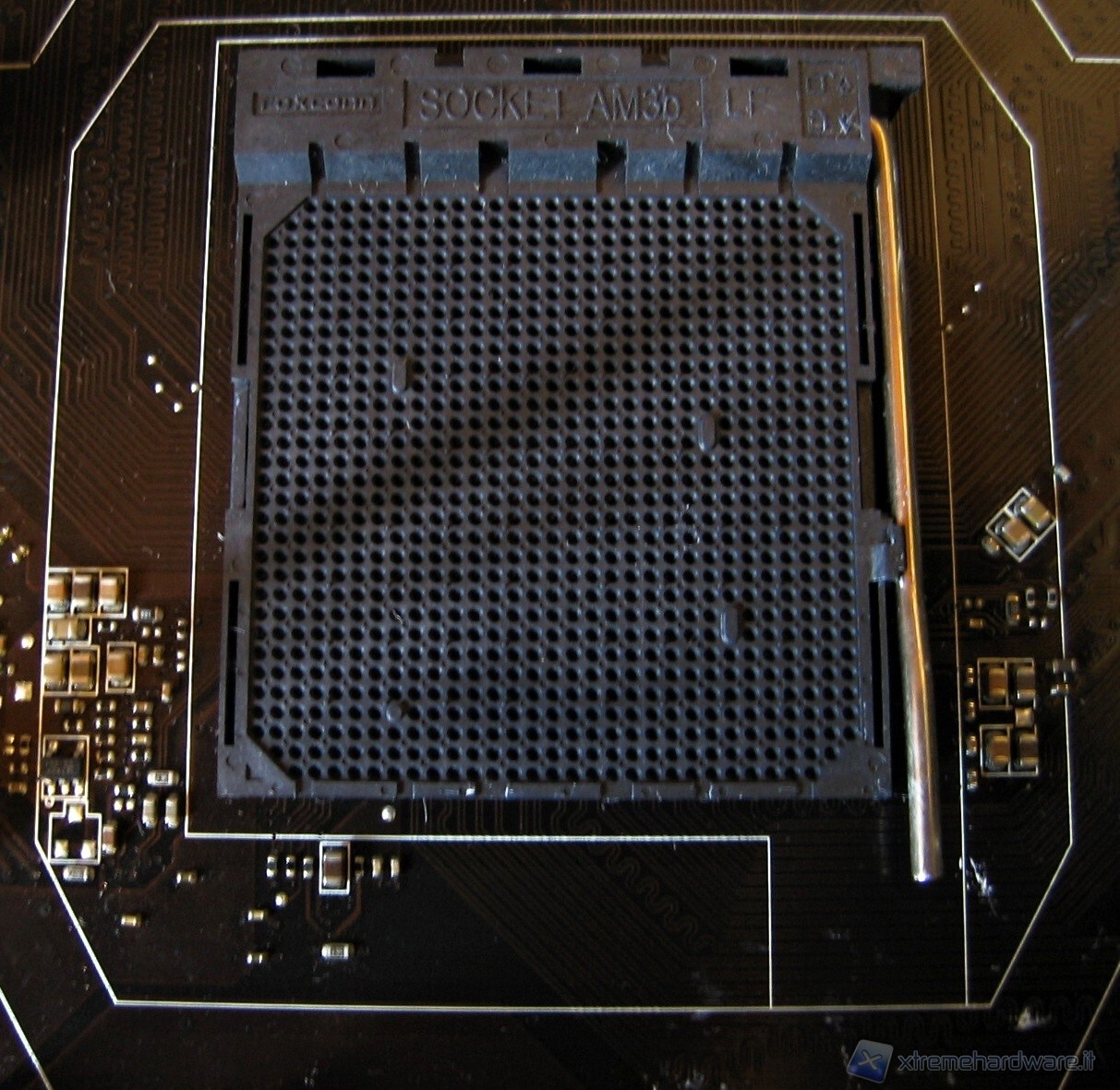 Il layout ci appare ben ordinato con molto spazio libero attorno al socket, in particolar modo se si toglie la staffa preinstallata per permettere il montaggio di dissipatori a liquido/azoto (per overclock spinti). Questo farà molto piacere agli overclockers. In foto potete vedere la staffa nera per l’aggancio del dissipatore standard. Per smontarla basta svitare le 4 viti che la tengono unita alla placca metallica sottostante.