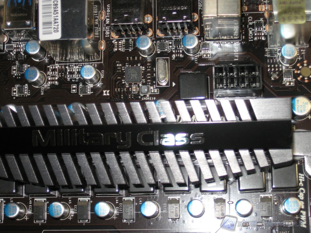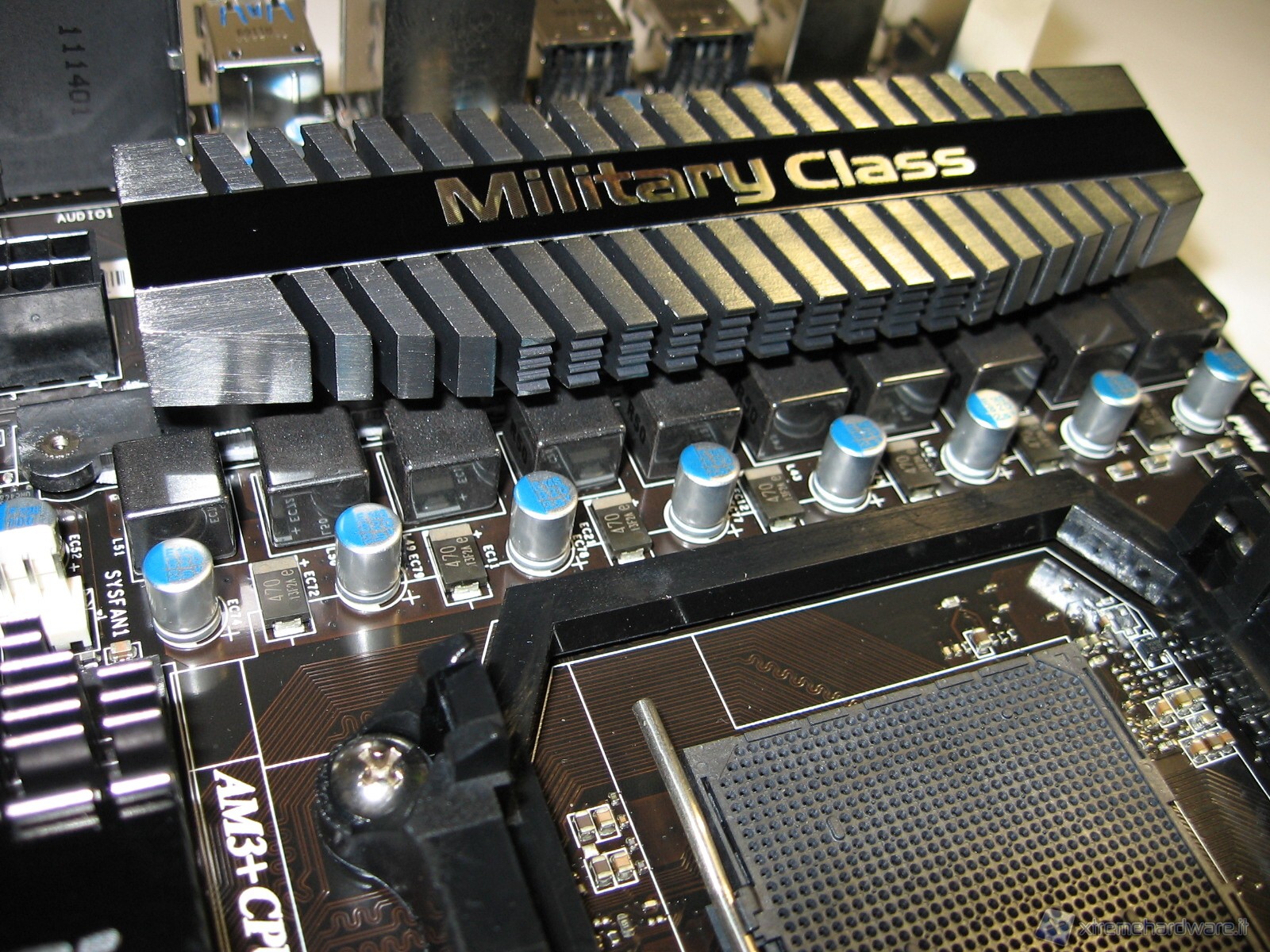Il socket AM3+ (o chiamato anche AM3b), a differenza di quelli Intel è uno zoccolo con tanti fori, esattamente 942 dove vanno ad inserirsi i piedini della CPU. Logicamente ha un suo verso d’inserimento quindi attenzione durante l’installazione. Accanto al socket notiamo le 10 fasi di alimentazione con componenti Military Class. In primo pianto abbiamo gli Hi-C Cap accanto ai classici solid Cap. In seconda fila notiamo le induttanze Icy Choke, mentre sotto il grande dissipatore sono presenti i mosfet.