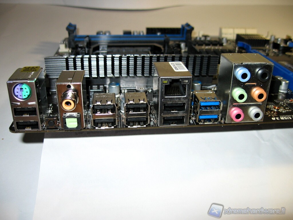 Partendo da sinistra in questa foto abbiamo l’attacco misto PS2 o per la tastiera o per il mouse e sotto le prime 2 porte USB 2.0. Proseguendo abbiamo il pulsante per effettuare il reset immediato della memoria CMOS. Proseguendo verso destra abbiamo da sopra l’attacco per il cavo coassiale dell’uscita SPDIF e sotto l’uscita ottica SPDIF. A destra abbiamo 2 blocchi da 2 porte USB 2.0. Di seguito troviamo una porta Ethernet (in standard Gigabit) ed altre 2 porte USB 2.0. Poi in blu per differenziarle dalle altre, 2 porte USB 3.0 e per finire il blocco dedicato ai connettori per l’entrata e l’uscita dei canali audio.
