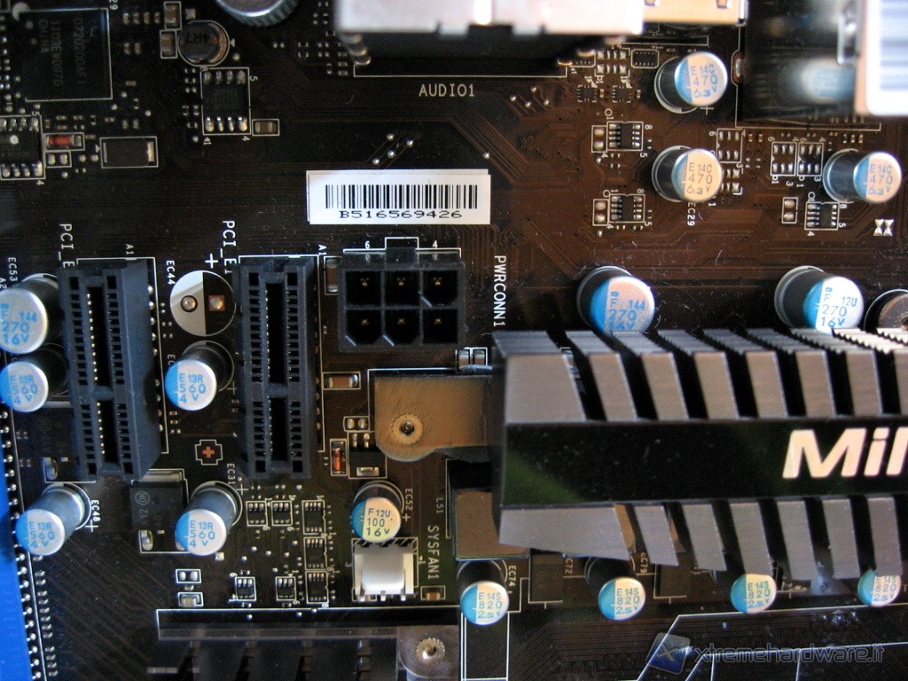 Lasciando la zona socket/porte, procedendo verso sinistra inquadriamo il connettore da 6 pin per l’alimentazione supplementare dello slot PCI-Express e quindi della scheda grafica. Notare la dicitura NEC USB 3.0 ed il relativo chip D720200AF1. Ricordiamo ai lettori che nella sezione introduttiva abbiamo detto che sia AMD che Intel non hanno implementato nativamente tale standard (fatta eccezione per Llano) ma si appoggiano a chip esterni.
