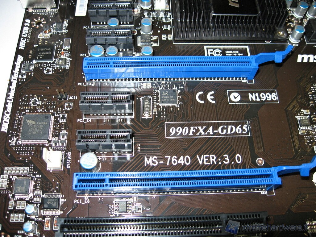 In questa foto notiamo la zona degli SLOT che ospitano le schede interne. In nero il 1°, 2°, il 4° ed il 5° sono slot PCI-Express x1. In blu il 3° ed il 6° sono slot PCI-Express x16 a piena lunghezza per le schede grafiche oppure a scalare verso velocità inferiori come per esempio controller RAID PCI-E ad x8/x4. Gli slot possono funzionare contemporaneamente a piena banda (x16,x16). Il 7° slot nero, da non confondere con gli altri più corti, è di tipo PCI a 32bit e può ospitare schede compatibili con questo standard. Sul PCB della scheda serigrafato a caratteri bianchi vediamo il modello/versione della scheda MSI 990FXA-GD65 che stiamo recensendo.