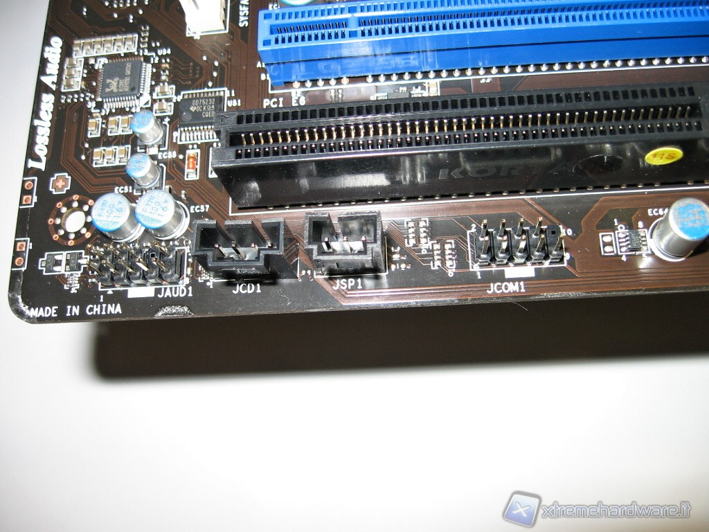 Passiamo adesso ad approfondire la zona riservata alla connettività e quindi al collegamento di tutti quei cavi che replicano sullo chassis (davanti e dietro) le varie porte. Da sinistra abbiamo il connettore dedicato al Front Panel Audio, ossia per replicare le uscite/entrate delle porte/altoparlante provenienti dallo chassis. Con la dicitura in bianco JCD1 abbiamo il connettore interno per l’uscita del segnale audio. Il connettore JSP1 è quello dedicato a replicare sul case l’uscita S/PDIF. Subito a destra poi JCOM1 è quello dedicato all’uscita della porta seriale COM.