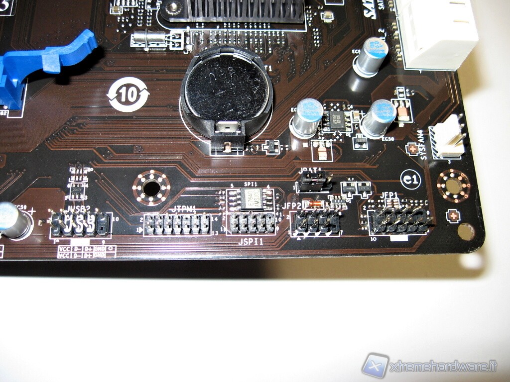 La zona JTPM1 è dedicata ad un’eventuale modulo opzionale TPM (Trusted Platform Module). Su JFP1 e JFP2 andremo a collegare tutti quei cavi provenienti dal frontalino principale del case del pulsante di Avvio, Reset, Led di Attività dell’Hardisk e dello Speaker. In alto possiamo vedere la classica batteria a pastiglia per la conservazione dei settaggi/timer nella CMOS ed alla sua destra il Jumper a 3 pin JBAT1 per il suo azzeramento.