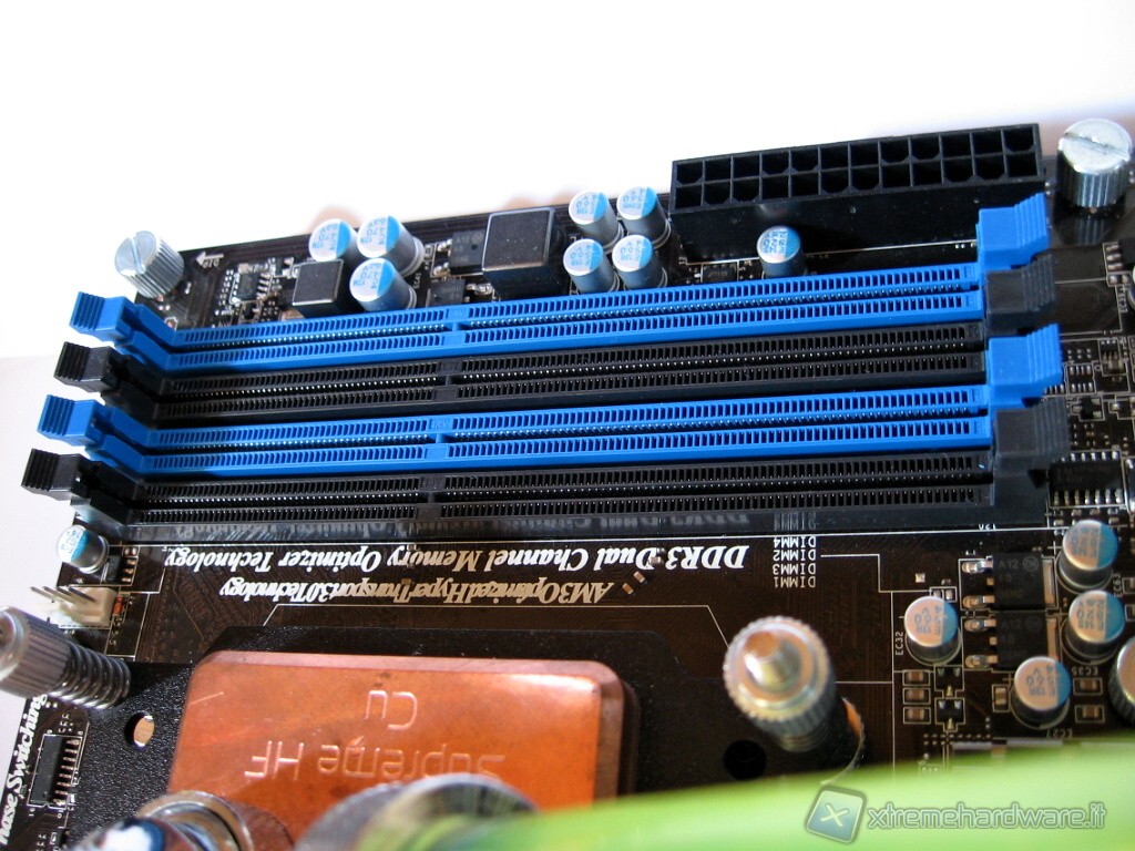 Inquadrati a coppie di 2, i 4 slot blu e neri dedicati ai moduli di memoria RAM DDR3 con velocità in overclock fino a 2133MHz.