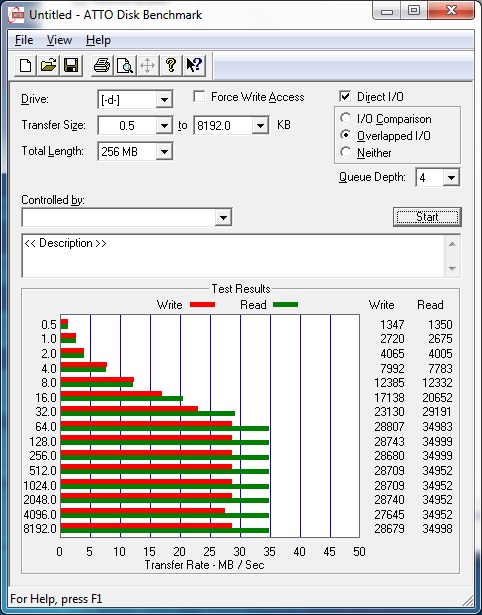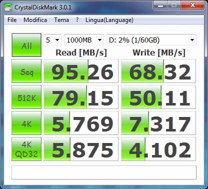 Con ATTO e CrystalDiskMark procediamo a testare la velocità sulle porte USB 2.0 e USB3.0 in dotazione alla Z68MA-ED55. I test sono effettuati con il pen drive Kingston DT-Ultimate 64GB recensito qui. ATTO è in sintesi un programma che misura la velocità di trasferimento dati degli hardisk connessi sulle porte USB e lo fa restituendo la velocità di trasferimento in lettura e scrittura di pacchetti di dimensioni crescenti, si parte da 512KB per finire agli 8MB. Stesso discorso con CrystalDiskMark, che esegue però test diversi evidenziando le prestazioni con dati più aleatori e usando una Queue Depth di 32 per i file di dimensione 4k.