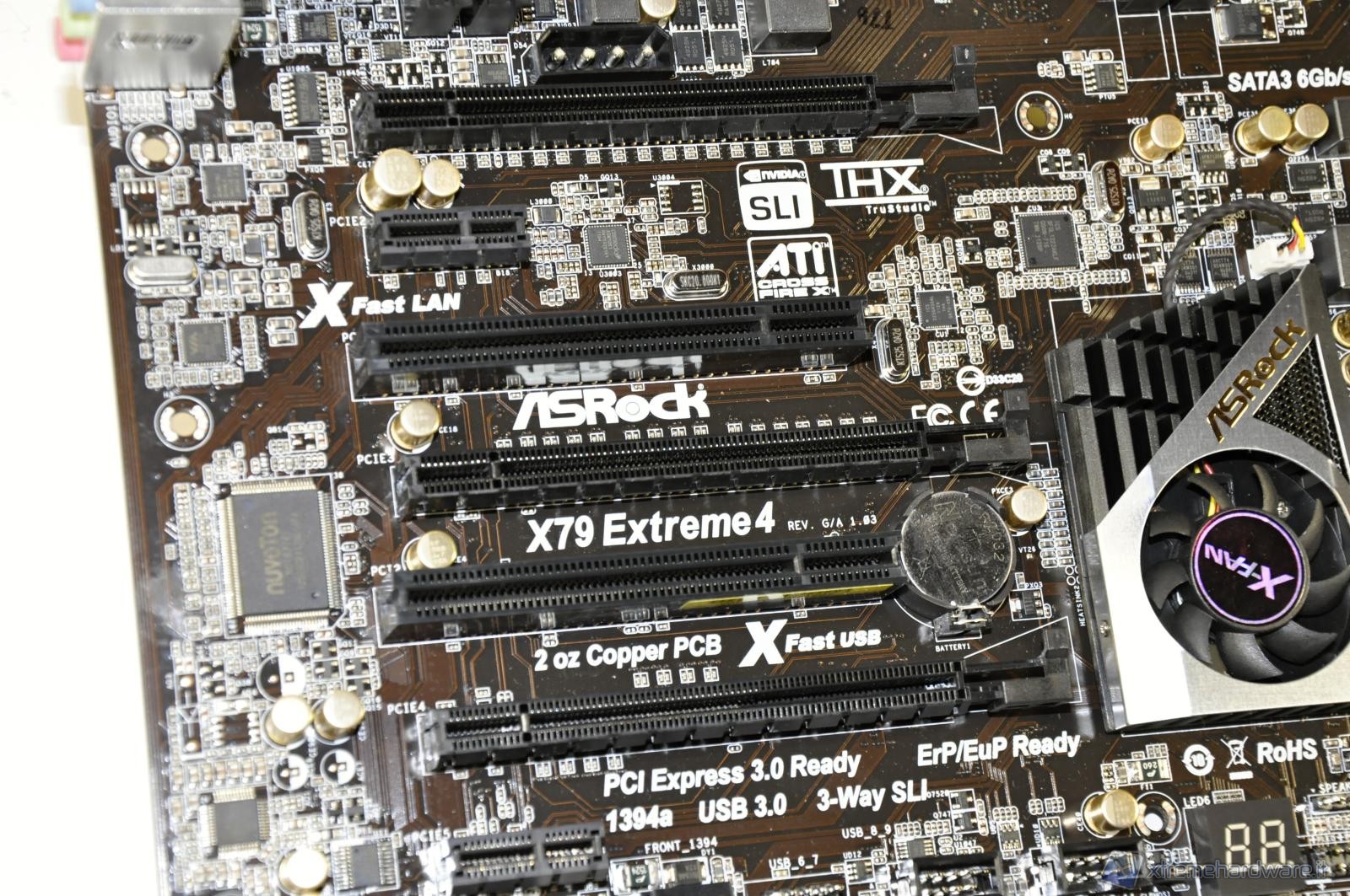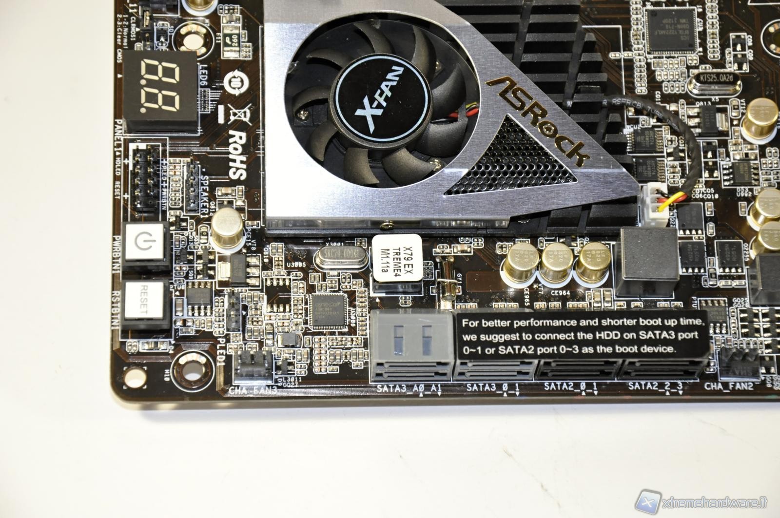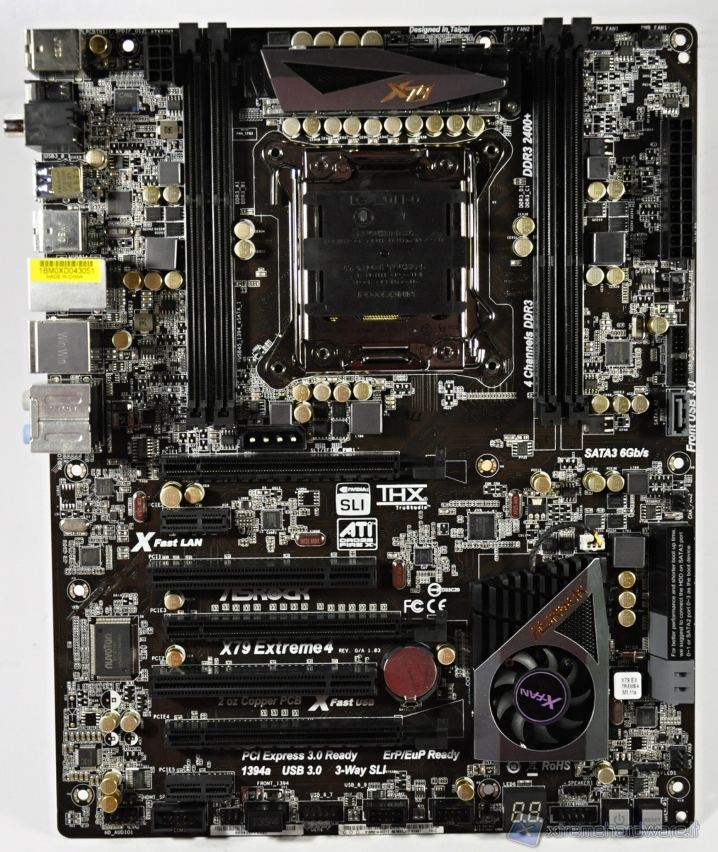 A catturare la vostra attenzione è sicuramente il dissipatore attivo con l’elegante placchetta di metallo con inciso il marchio del produttore, ma sicuramente non vi sono sfuggite le 8 porte SATA di cui quelle grigie nel nuovo standard 3.0 mentre quelle nere legate al vecchio standard 2.0. Le 6 porte più in alto sono gestite dal controller del chipset X79, più veloce rispetto al controller ASMedia. Altri 2 attacchi a 3 pin per le ventole, mentre sulla sinistra i 2 tasti per l’accensione/spegnimento ed il reset del sistema.