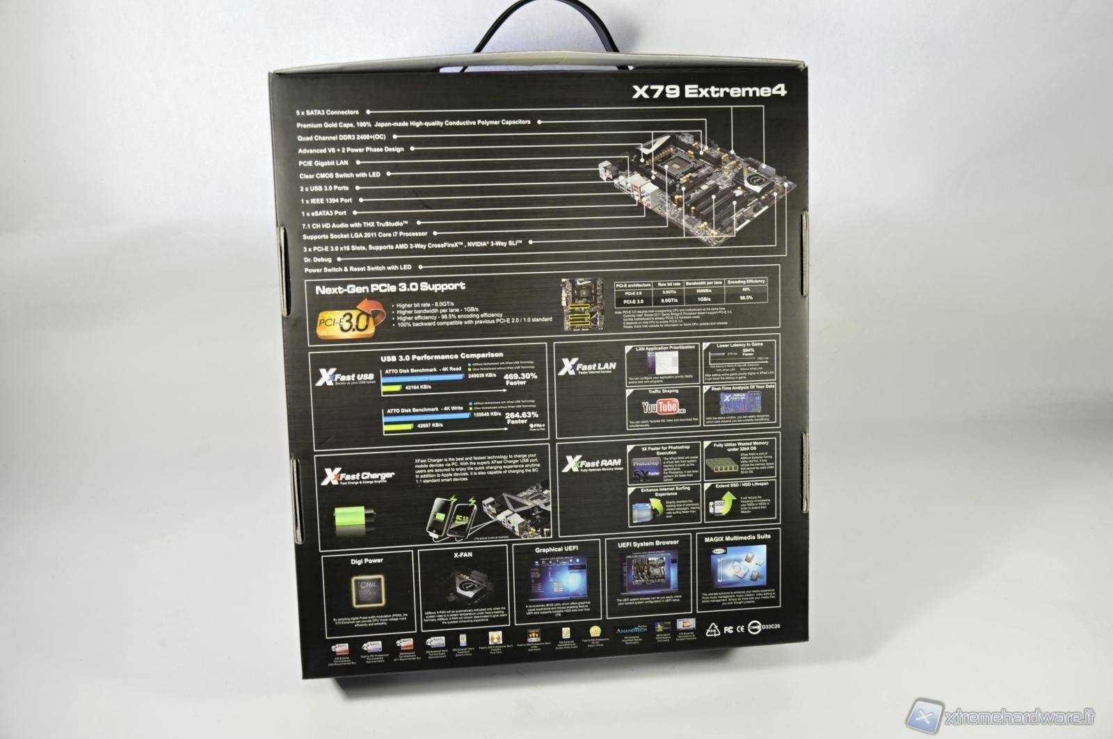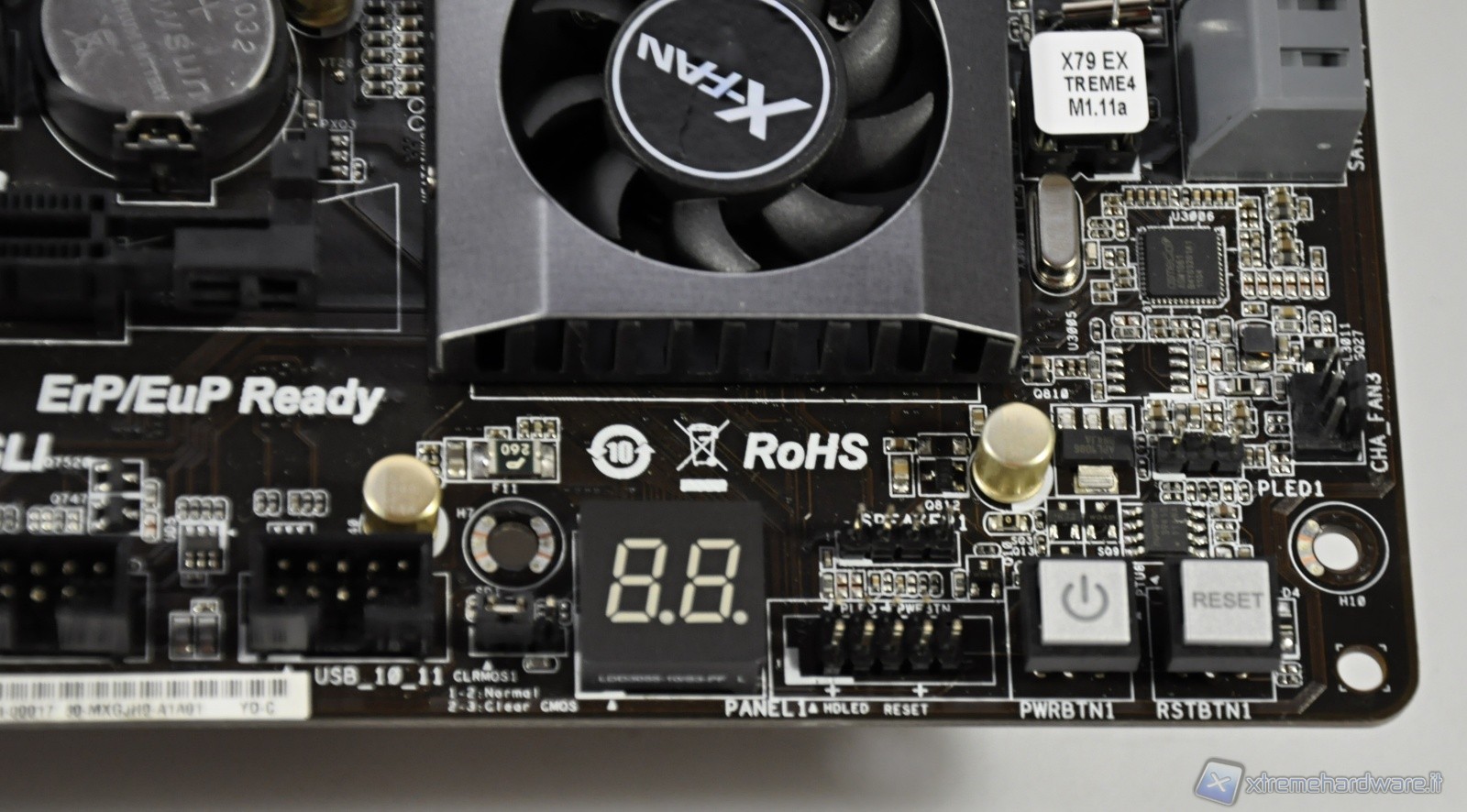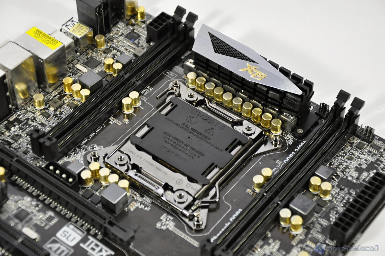 A catturare la vostra attenzione è sicuramente il dissipatore attivo con l’elegante placchetta di metallo con inciso il marchio del produttore, ma sicuramente non vi sono sfuggite le 8 porte SATA di cui quelle grigie nel nuovo standard 3.0 mentre quelle nere legate al vecchio standard 2.0. Le 6 porte più in alto sono gestite dal controller del chipset X79, più veloce rispetto al controller ASMedia. Altri 2 attacchi a 3 pin per le ventole, mentre sulla sinistra i 2 tasti per l’accensione/spegnimento ed il reset del sistema.