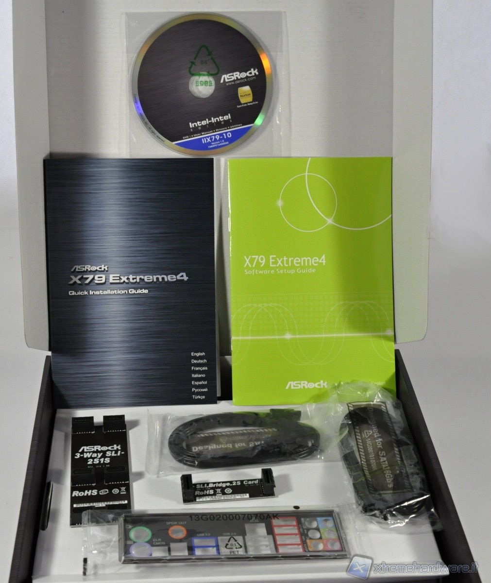 Il bundle è essenziale seppur presenti i Bridge per mettere in SLI/CrossFireX le schede video. Realizzato in multilingua il manuale rispettivamente in Inglese/Tedesco/Francese/Italiano/Spagnolo/Russo/Turco ed accompagnato da un secondo libretto guida che aiuta nell’operazione di collegamento/avvio.