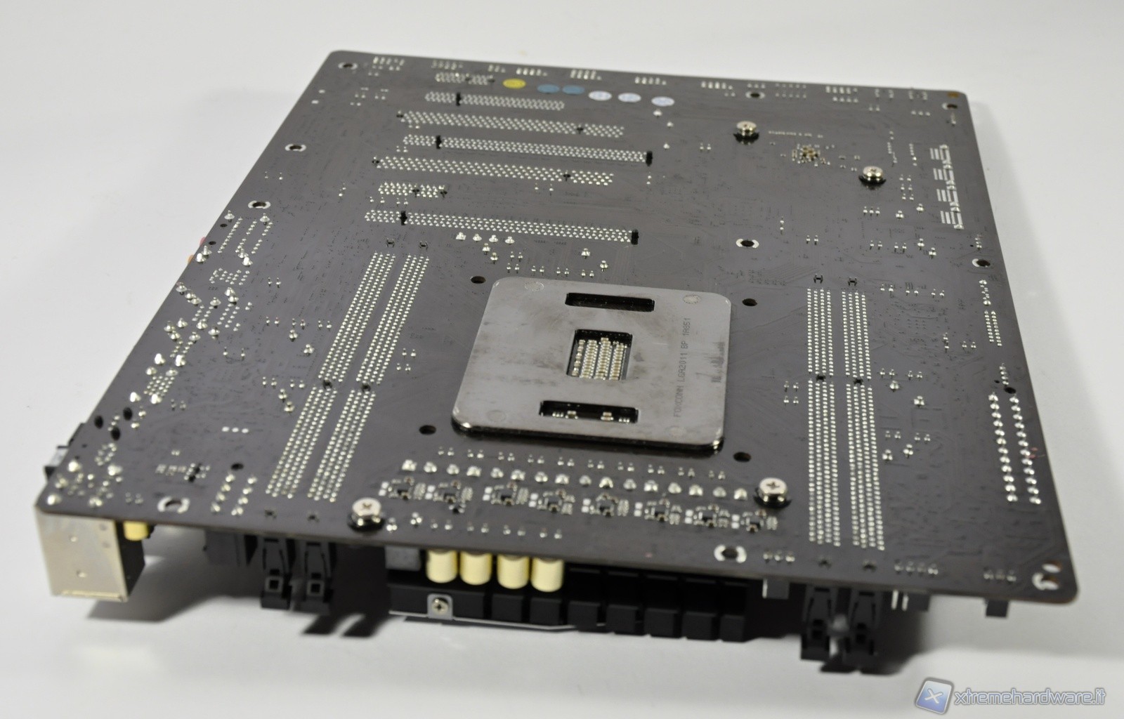 Nella parte sottostante emerge la staffa di ritenzione del socket 2011 oltre alle 4 viti per il fissaggio dei 2 dissipatori.