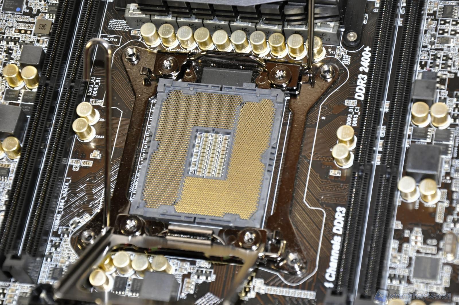 L’inquadratura della zona socket rivela la presenza del connettore molex (adiacente allo primo slot PCI Express) a supporto dell’alimentazione assorbita da schede video particolarmente prestanti ed affamate di energia. Potete notare altresì il nuovo sistema a doppia chiusura del socket 2011 progettato da Intel oltre al connettore ad 8 Pin per l’alimentazione ausiliaria al processore. Relativamente piccolo il dissipatore nella parte superiore del socket, per il raffreddamento della circuiteria di alimentazione della CPU. Essendo passivo necessiterà di una buona areazione in questa zona, specialmente in fase di overclock. Consigliamo particolare attenzione a tutti coloro che installeranno un sistema di dissipazione a liquido sulla CPU.