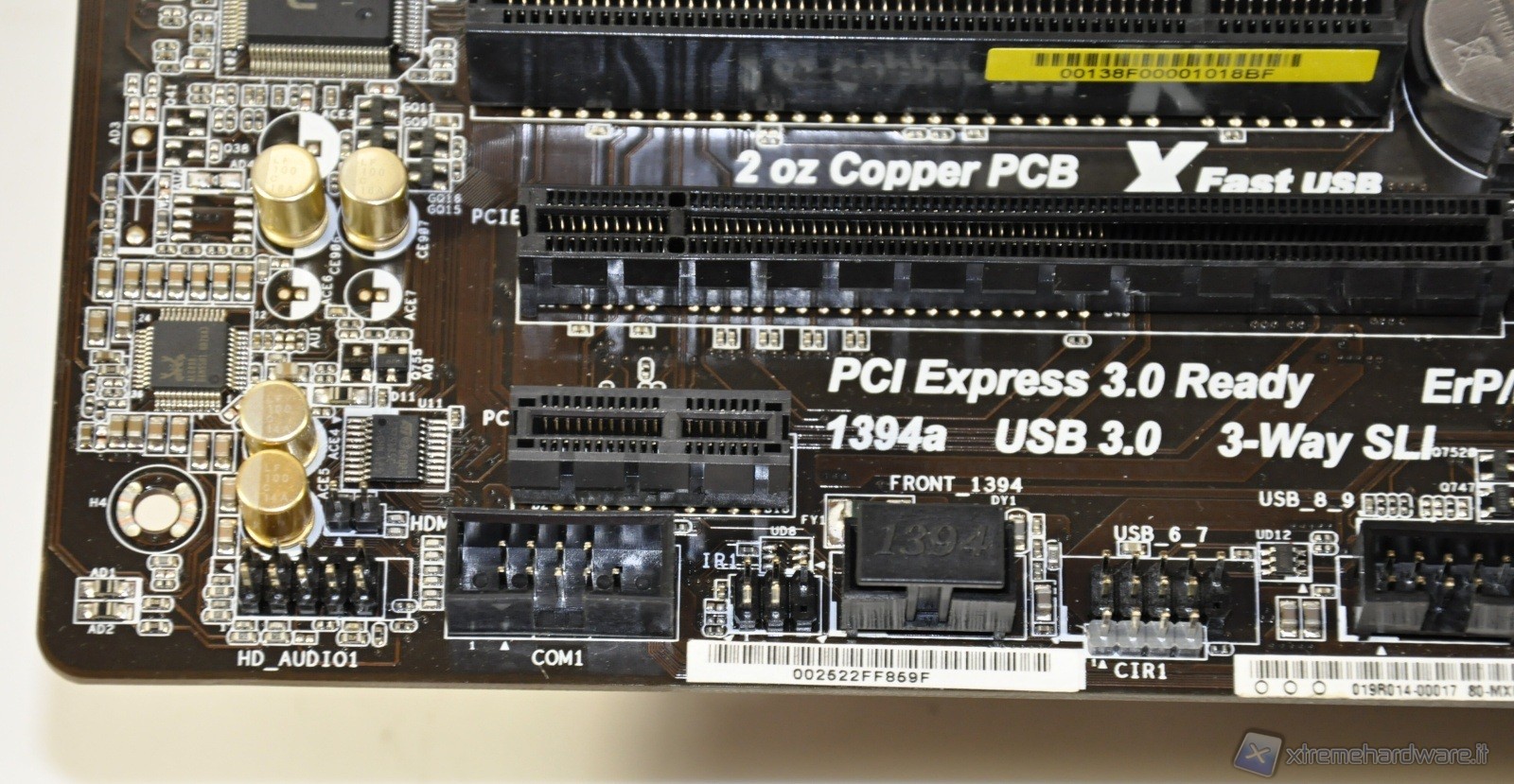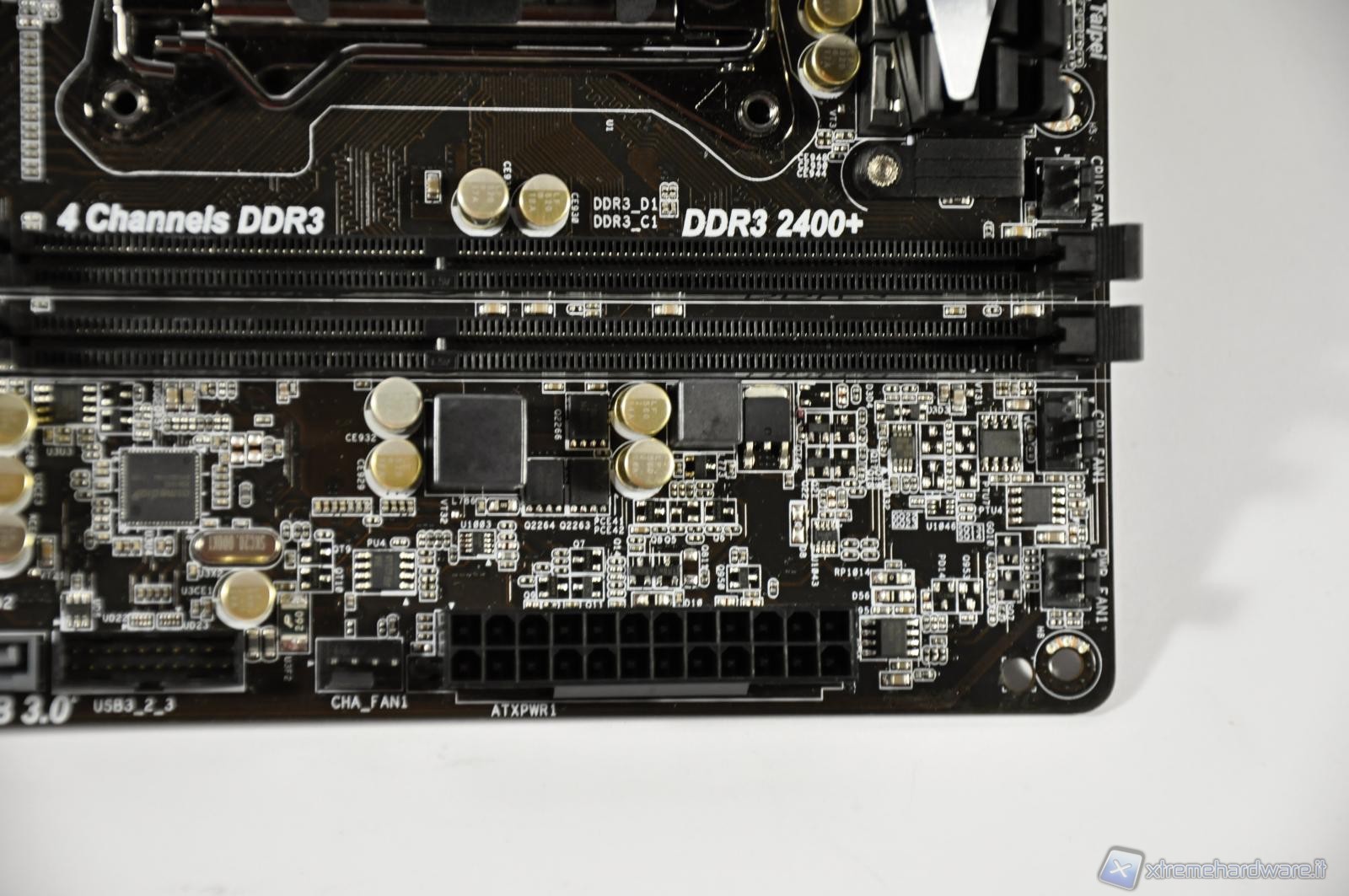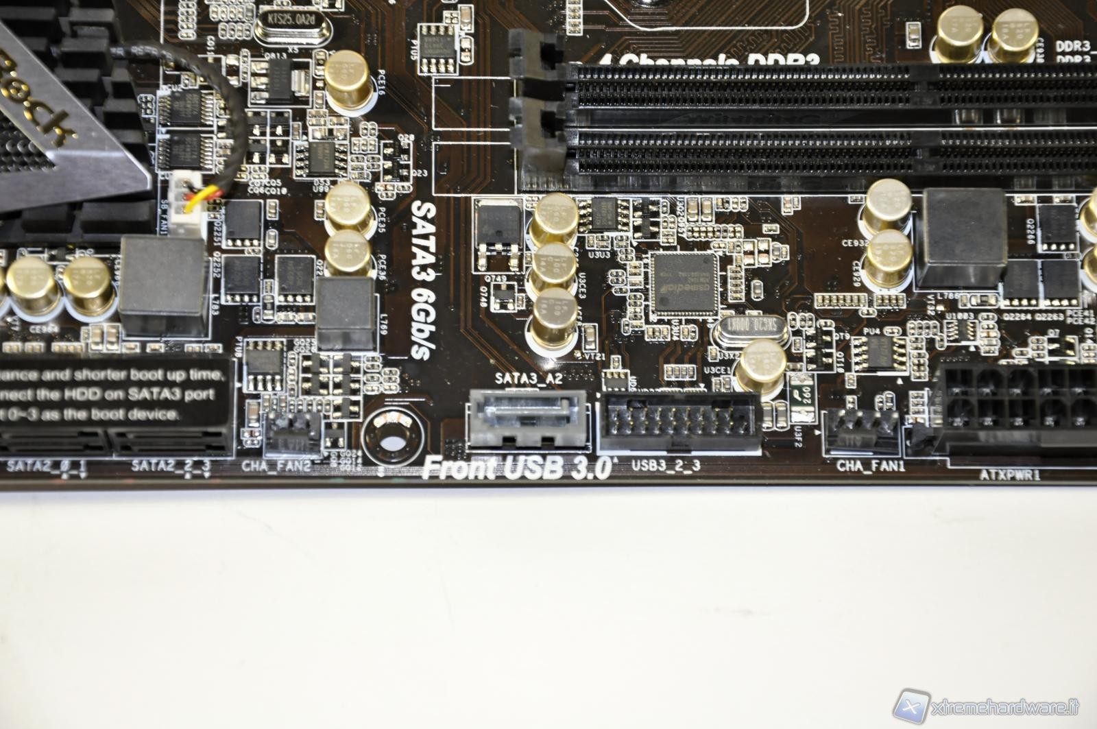 In foto il classico connettore ATX di alimentazione a 24 pin oltre che 3 primi attacchi per eventuali ventole da collegare al sistema. In basso a sinistra l’attacco per 2 porte USB in standard 3.0. Le USB 3.0 sono gestite da controller ASMedia ASM1042.