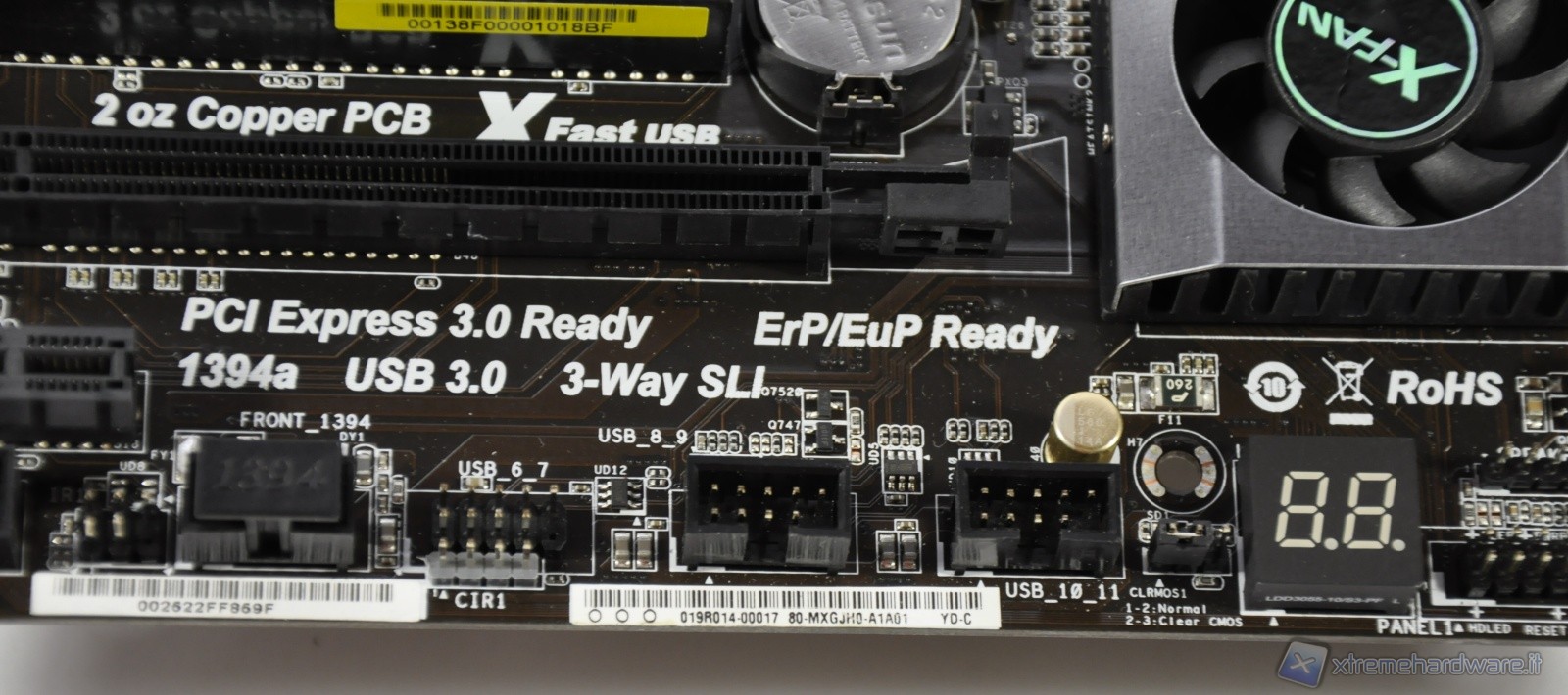 In evidenza il display per la visualizzazione dei codici in fase di boot. Alla sua destra il gruppo di Pin “System Panel Header”, mentre immediatamente a sinistra i 3 pin con il relativo Jumper per il reset della CMOS.