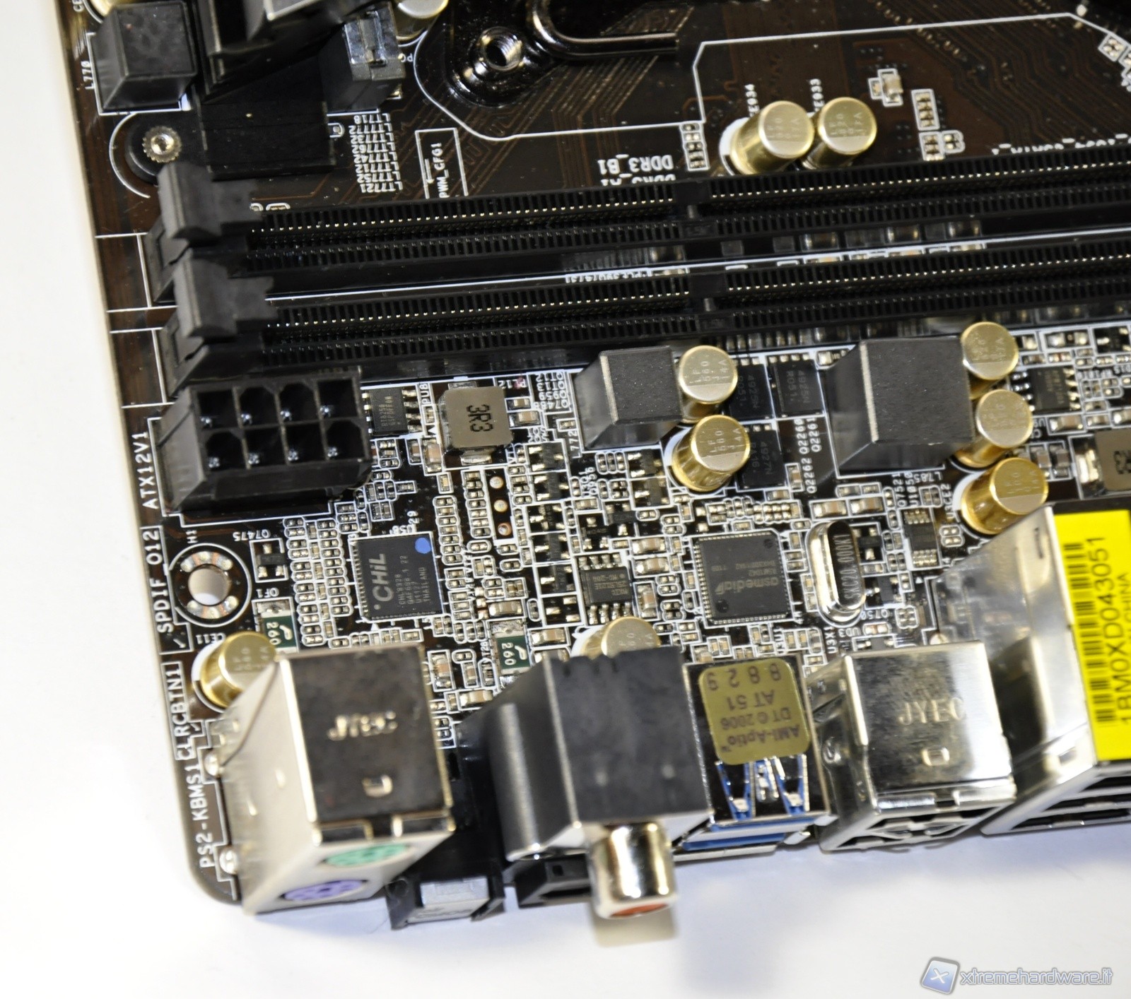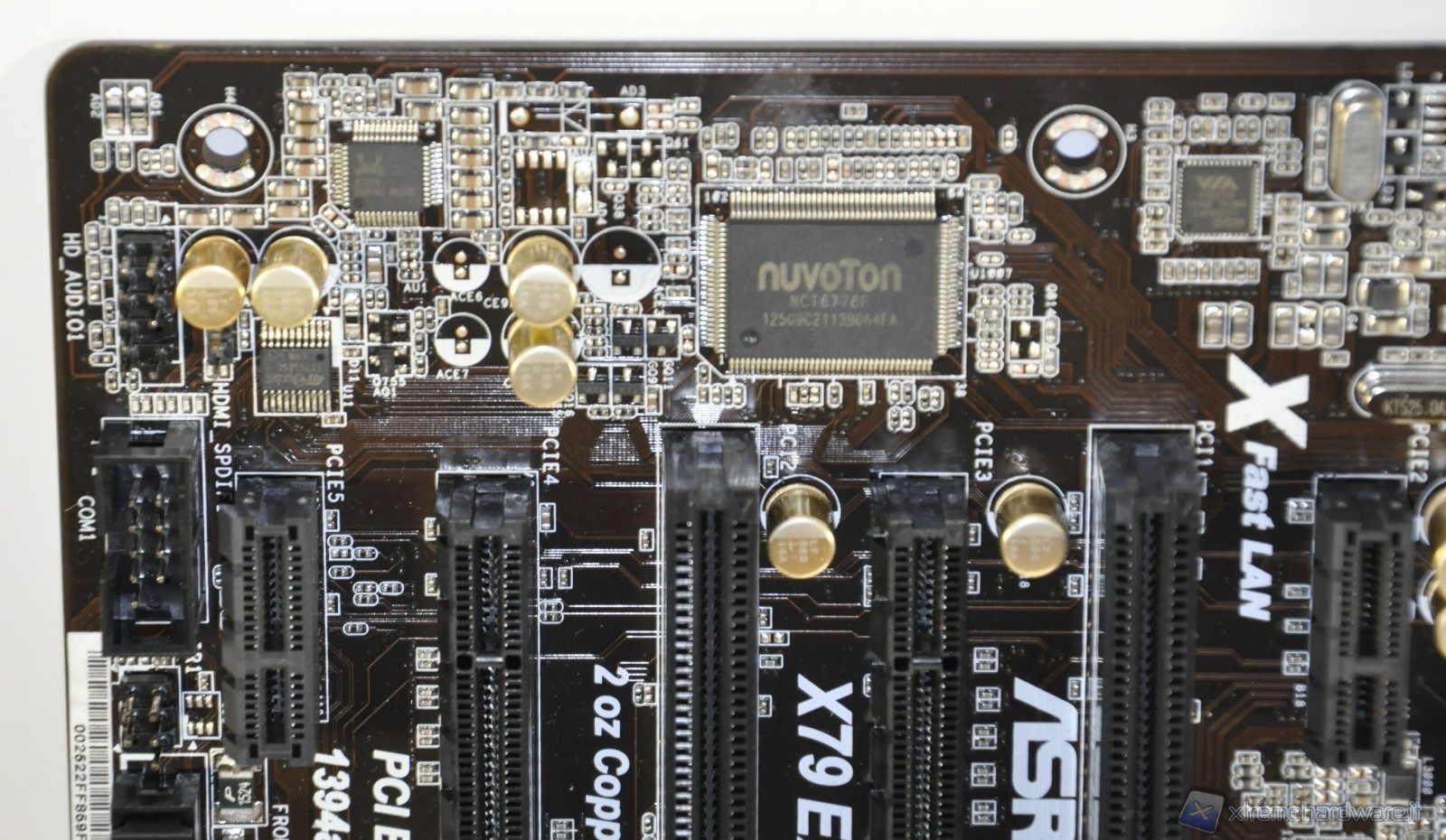 A sinistra il chip Realtek ALC898 dedicato alla codifica del segnale audio, mentre alla sua destra ben più grande del precedente abbiamo il chip Nuvoton NCT6776F importante per il monitoraggio dei parametri vitali del sistema come temperatura, tensione, etc.