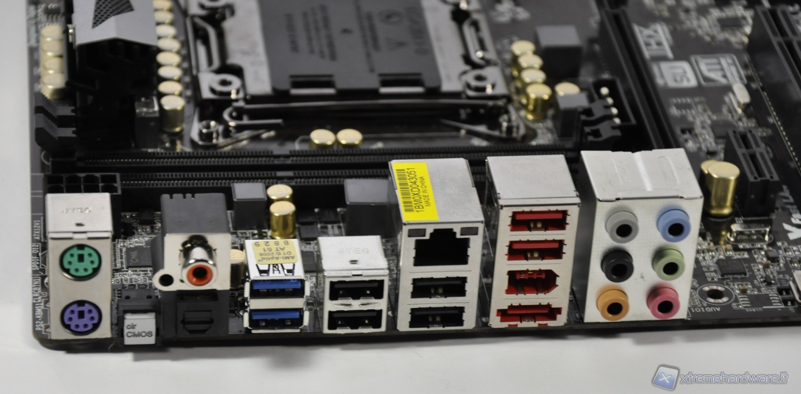 Analizziamo il pannello di Input/Output posteriore. Il primo blocco è relativo agli attacchi PS2 per il collegamento di mouse/tastiera. Di seguito a destra il pulsante per la cancellazione rapida (Reset) della memoria CMOS. Poi abbiamo il blocco relativo a due porte SPDIF, in alto coassiale ed in basso ottica. Proseguendo sempre verso destra abbiamo in blu due prime porte USB in standard 3.0. Di seguito altre 2+2 porte nere USB2.0 di cui in alto l’attacco LAN in standard Gigabit. Il blocco con attacchi rossi è cosi suddiviso: 2 porte USB2.0 partendo dall’alto, 1 porta FireWire ed 1 porta eSATA3. Per finire il blocco dei 6 attacchi relativo ai segnali IN/OUT audio.