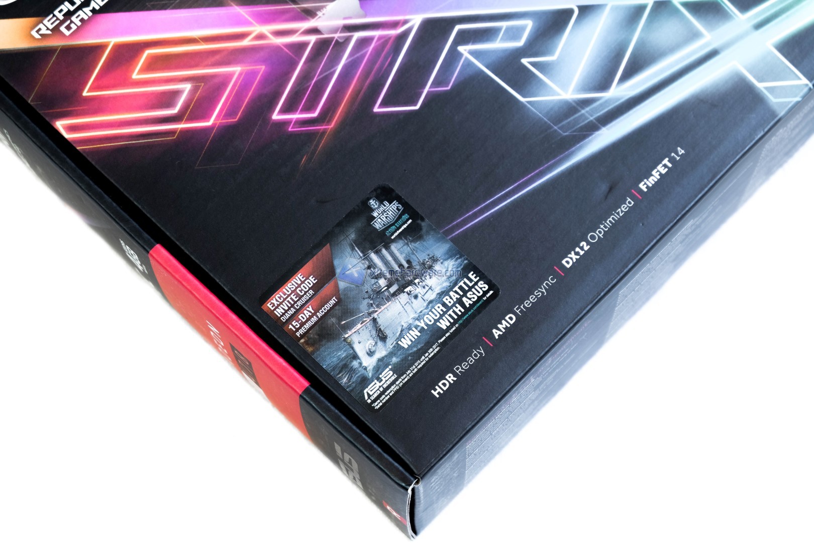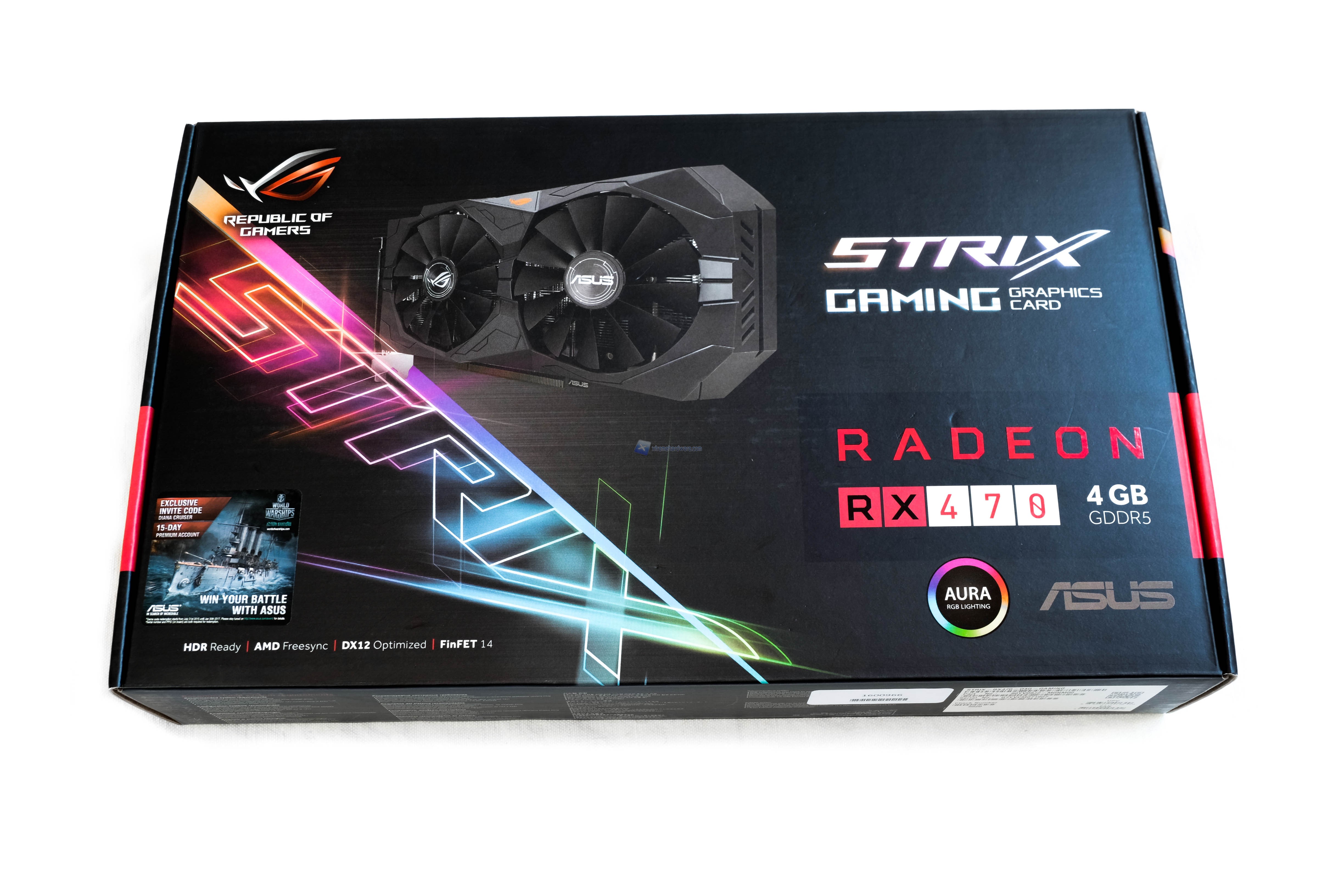 La confezione è abbastanza compatta, ma in grado di garantire ugualmente un’ottima protezione durante il trasporto. Nella parte frontale troviamo l’immagine del prodotto, accompagnata dal nome della scheda video e dal logo Strix. In basso, oltre alle varie tecnologie supportate dalla scheda video, troviamo anche un tagliandino per usufruire dell’account premium nel gioco World of Warships.