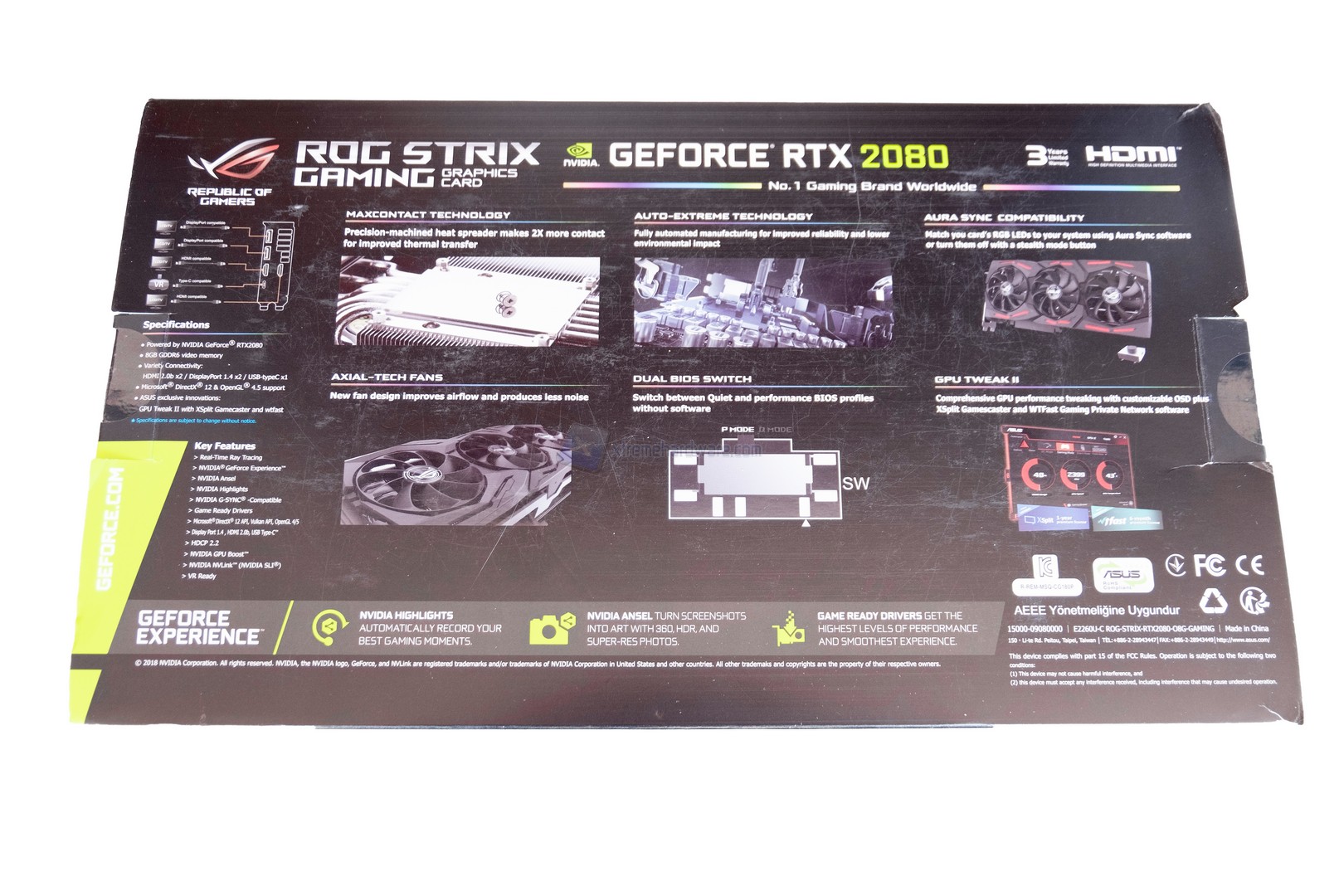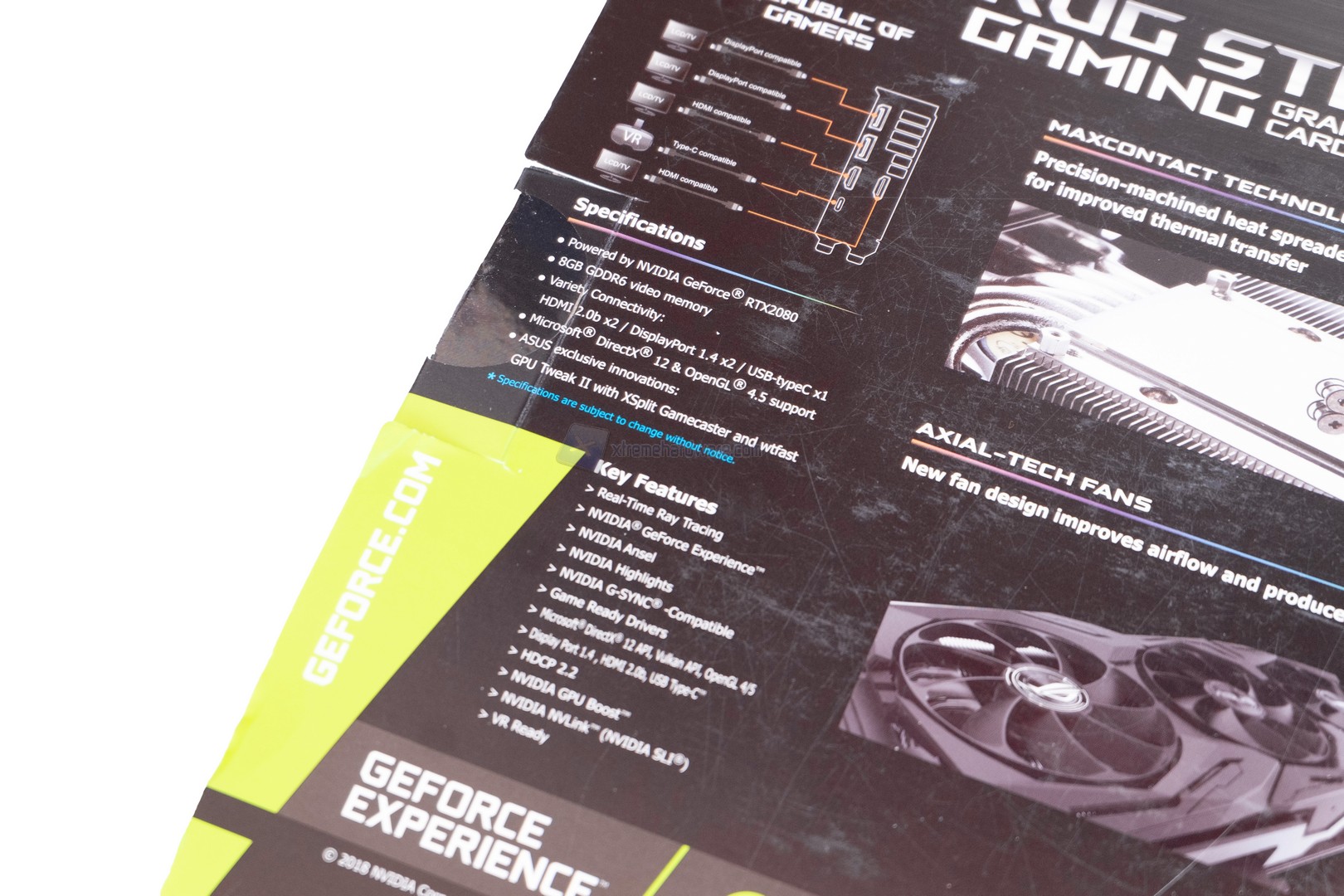 La confezione dell’ASUS RTX 2080 Strix si caratterizza per il classico design ASUS, infatti nella parte frontale troviamo il nome del prodotto, un’immagine dello stesso, le caratteristiche principali ed alcune tecnologie supportate.