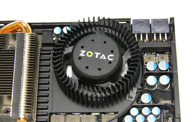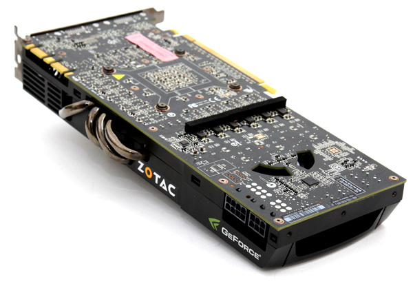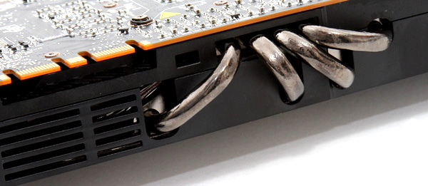 Il dissipatore, assorbe calore dalla superficie della GPU e dai circuiti di memoria. Nella GTX 480 cinque heatpipe conducono il calore fino a una serie di fini lamelle in alluminio, mentre una classica ventola spinge l'aria attraverso la copertura della scheda fino alla parte posteriore, da dove viene espulsa. Vedremo in seguito come si comporta questo tipo di dissipazione.