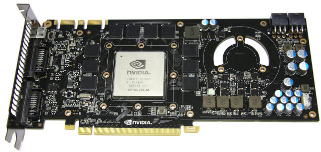 Togliendo il massiccio dissipatore, possiamo ammirare in tutta la sua bellezza il PCB della scheda con l’enorme “die” del GF100.