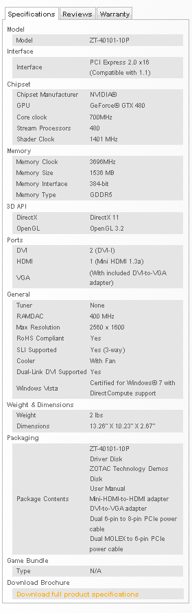 Riportiamo di seguito le caratteristiche essenziali della Zotac GeForce GTX 480: