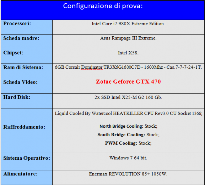 Per il sistema di prova ci siamo avvalsi di una scheda madre Asus equipaggiata con chipset Intel X58, in particolare è stato scelta il modello Rampage III Extreme noto per le sue particolari caratteristiche di scheda “gaming”.