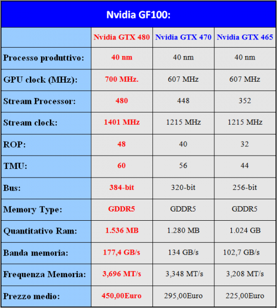 Riassumiamo nella tabella sottostante tutte le caratteristiche tecniche delle tre soluzioni Nvidia GF100: