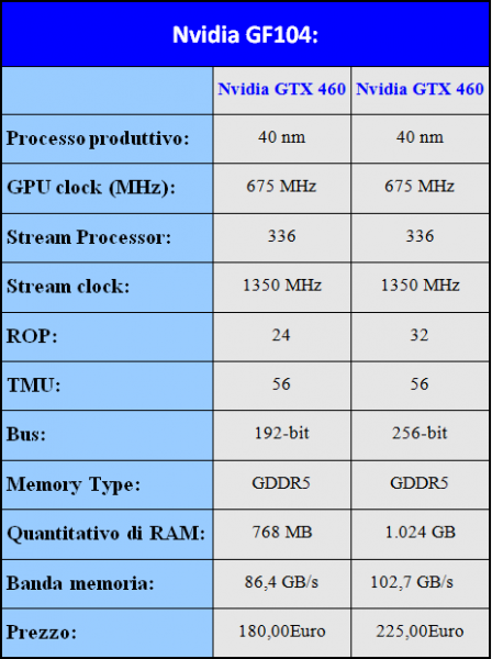 Riassumiamo nella tabella sottostante tutte le caratteristiche tecniche delle due soluzioni Nvidia GF104: