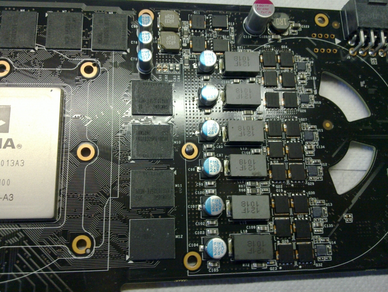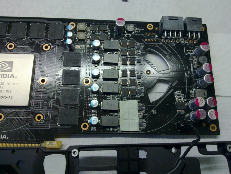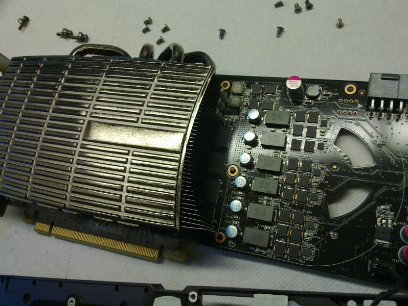 Togliendo il massiccio dissipatore, possiamo ammirare in tutta la sua bellezza il PCB della scheda con l’enorme “die” del GF100.