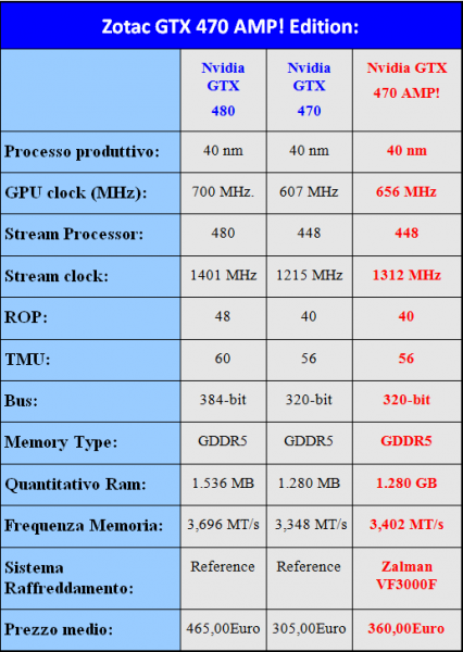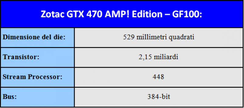Riassumiamo nella tabella sottostante tutte le caratteristiche tecniche della soluzioni Zotac GTX 470 AMP! Edition: