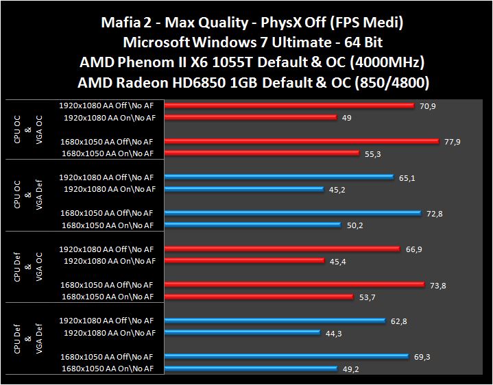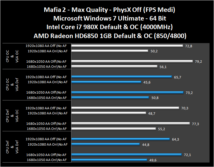 Nel grafico che segue, i risultati ottenuti con il benchmark interno del gioco. I test sono stati eseguiti alla massima qualità, alle due risoluzioni di riferimento con vari livelli di Antialiasing.