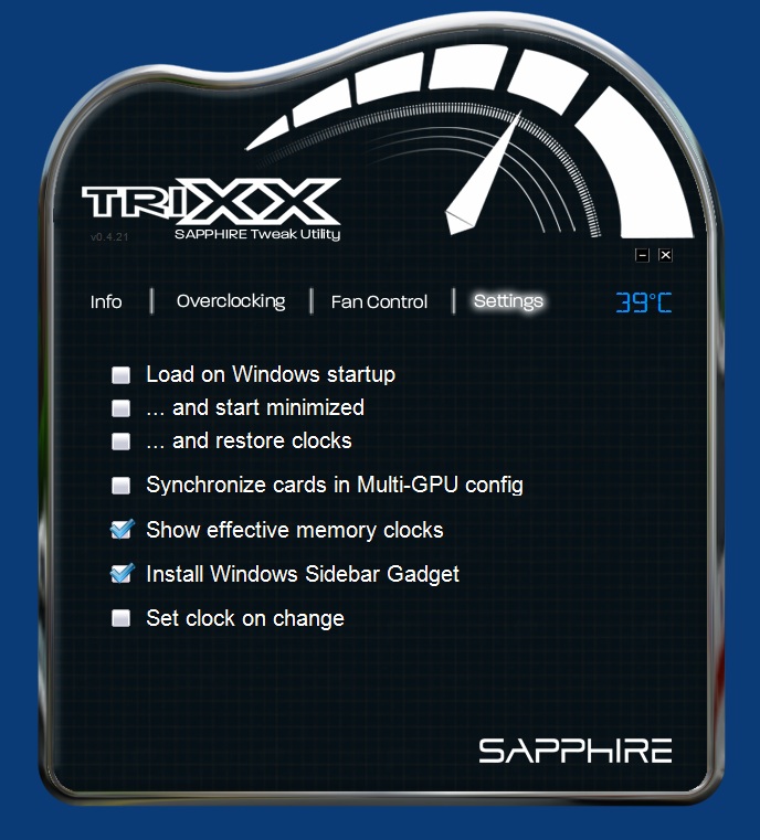 Come abbiamo avuto modo di leggere, nel corso della recensione, la scheda è già stata provata al massimo consentito da pannello di controllo dei Catalyst, ovvero a 850/4800, rispettivamente per core e memorie. Ovviamente questo limite può essere “aggirato” in svariati modi. E’ possibile ad esempio intervenire a livello Bios o più semplicemente utilizzando software alternativi come l’ormai famoso AfterBurner di MSI, oppure il recente TriXX di Sapphire. Entrambi questi software funzionano indipendentemente dalla marca della scheda in uso, quindi saranno utilizzabili da tutti senza problemi di sorta. Ecco come appare TriXX una volta eseguito: