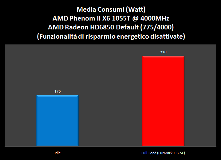 A seguire i consumi del sistema di prova completo (Piattaforma AMD OC), misurati direttamente alla presa di corrente. Le misurazioni sono state ripetute più volte, nel grafico la media delle letture in condizioni di Idle e in Full Load (10min di FurMark in modalità Extreme Burning Mode):