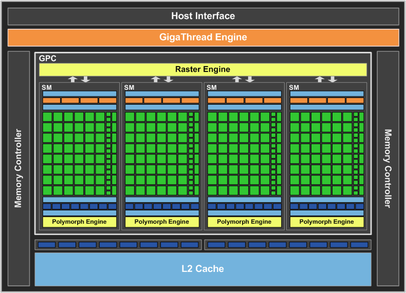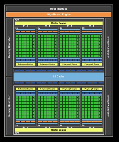 Con questo processore grafico, NVIDIA riesce, finalmente, a coprire la fascia media del mercato. Per raggiungere questo obiettivo è stato necessario, al fine di contenere i costi produttivi, semplificare l’architettura alla base del precedente GF104. La nuova GPU, infatti, è all’incirca la metà di un GF104, a seguire vi mostriamo lo schema dell’architettura: