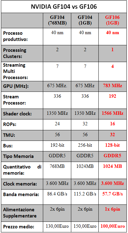 Nella seguente tabella sintetizziamo le principali differenze tra GF104 e il nuovo GF106: