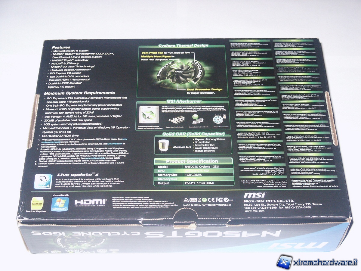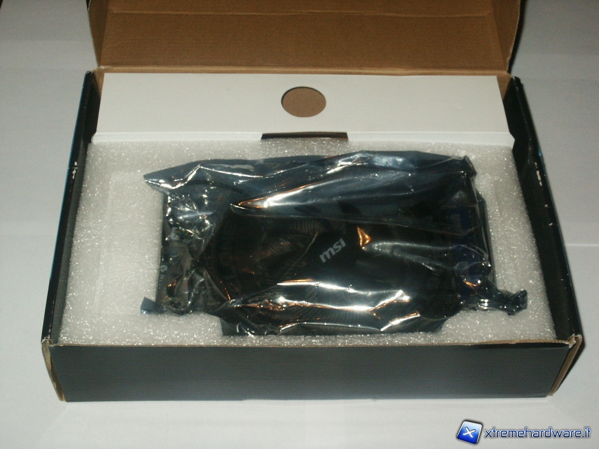 La scheda è giunta in redazione all’interno della confezione di cartone originale prevista da MSI. Nella parte frontale spicca la foto del dissipatore impiegato su questo modello, oltre alle caratteristiche principali del prodotto contenuto.