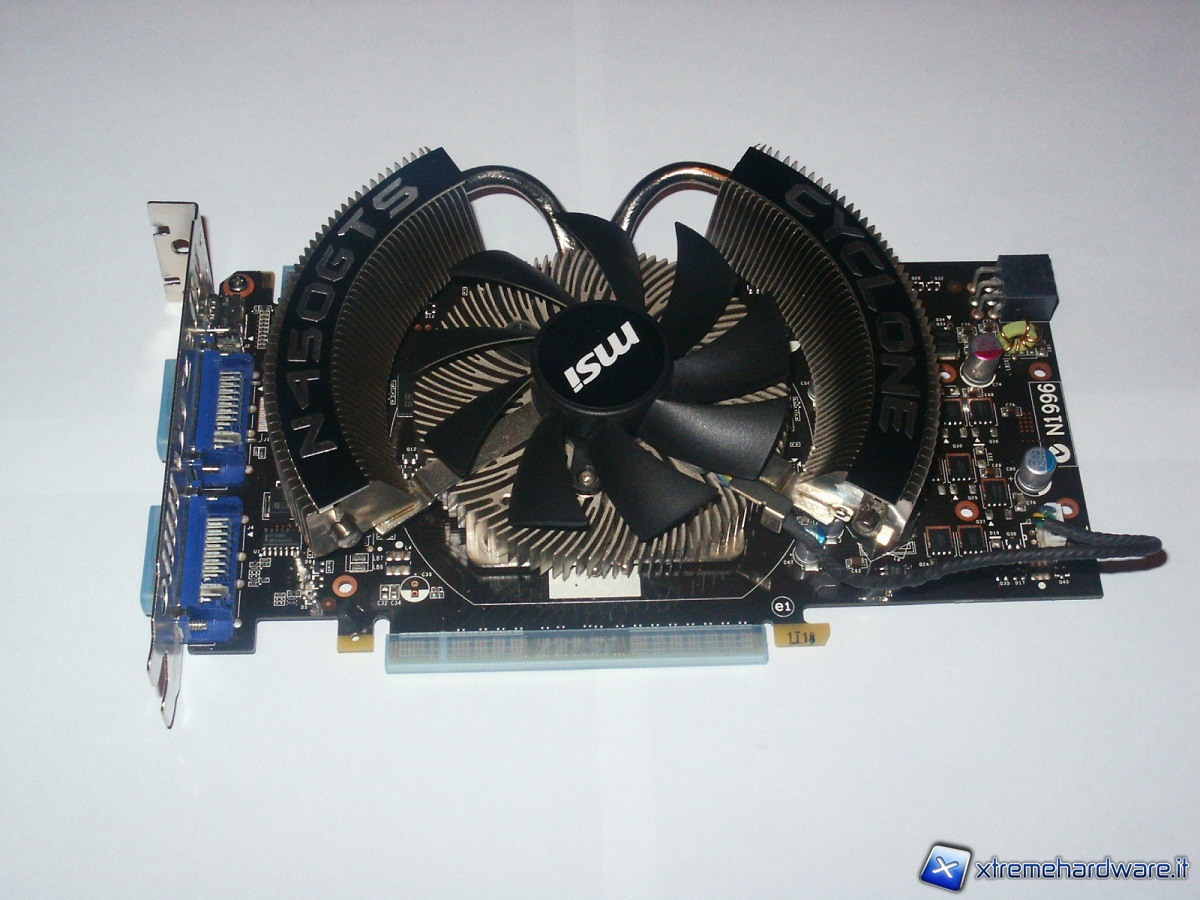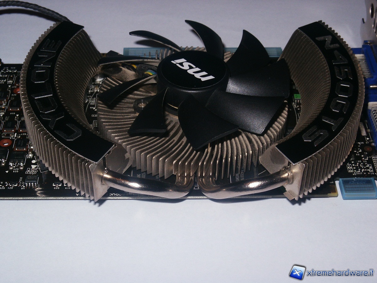 Osservando da vicino la Cyclone, non possiamo non notare l’imponente dissipatore circolare, in rame nichelato, impiegato da MSI. Il produttore dichiara temperature inferiori di ben 17°C rispetto alla soluzione NVIDIA reference. La ventola PWM, del diametro di 90mm, è davvero molto efficiente e silenziosa. Due heatpipe, di generose dimensioni, si dipartono dalla base del dissipatore e conducono il calore ai due corpi in alluminio semi-circolari.