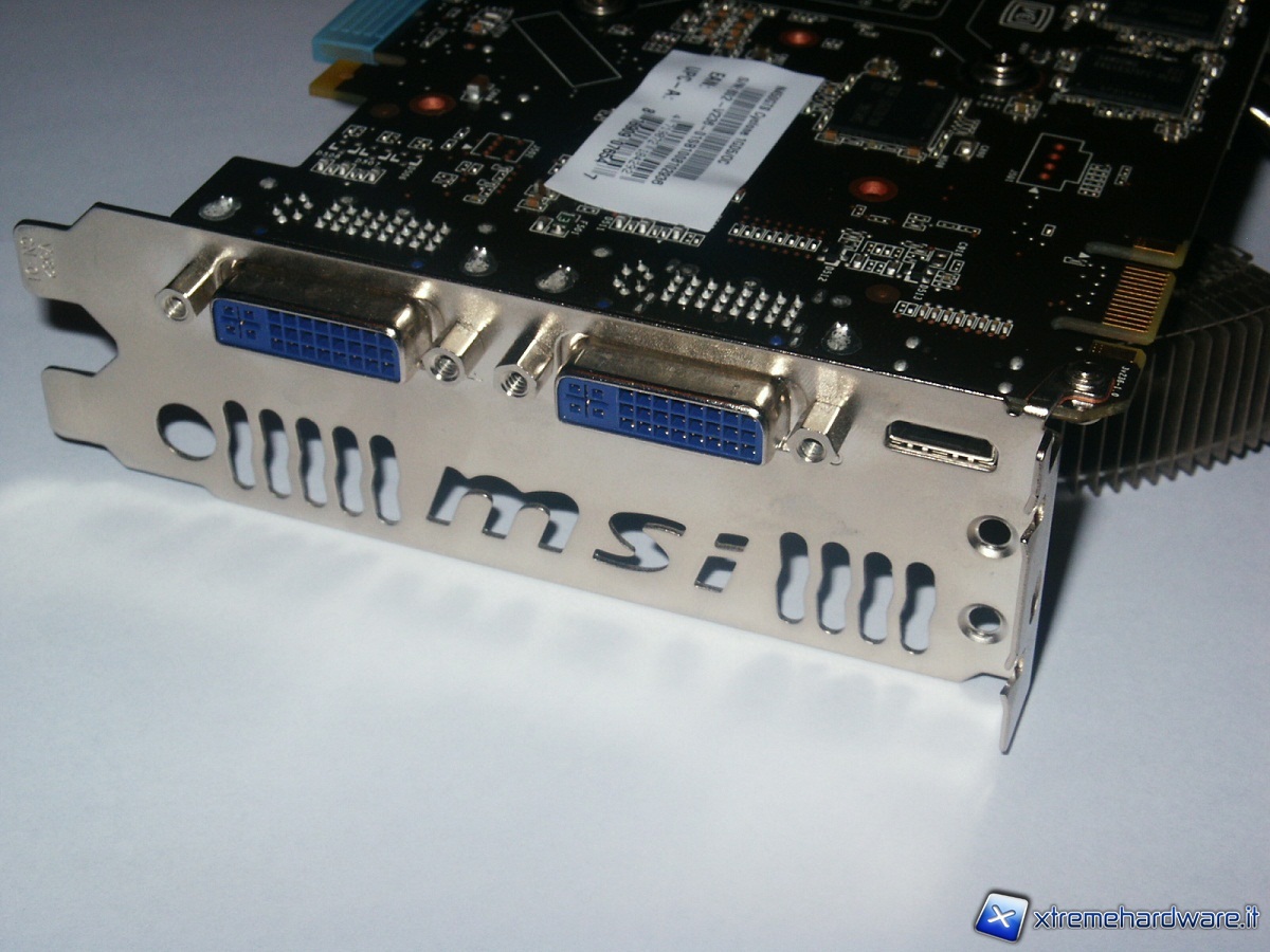 Sul retro della scheda sono presenti i due connettori DVI dual-link e un connettore Mini-HDMI. Molto bello il logo MSI intagliato nel bracket posteriore.