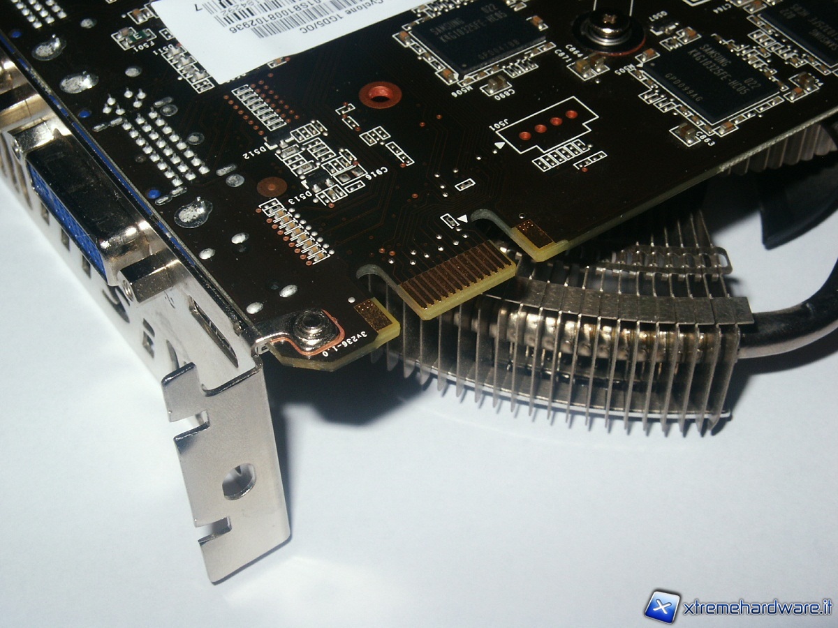 Nella parte finale della scheda si può notare il connettore ausiliario di alimentazione, da 6-pin. La GeForce GTS 450 ha un TDP di soli 106W. La circuiteria di alimentazione ha un design a 4 fasi, come previsto da NVIDIA.