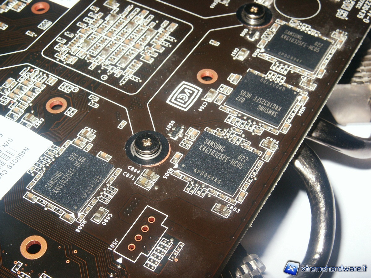 Le ram sono di tipo GDDR5 prodotte da Samsung riportanti la serigrafia K4G10325FE-HC05. Come si intuisce dalla stessa, queste sono certificate per operare ad una frequenza di 4000MHz effettivi, la medesima fissata da MSI su questo modello. Unitamente al bus dati di 128bit si ottiene una banda passante di 64GB/s. La quantità di memoria onboard è pari a 1.024MB, suddivisi in otto moduli.