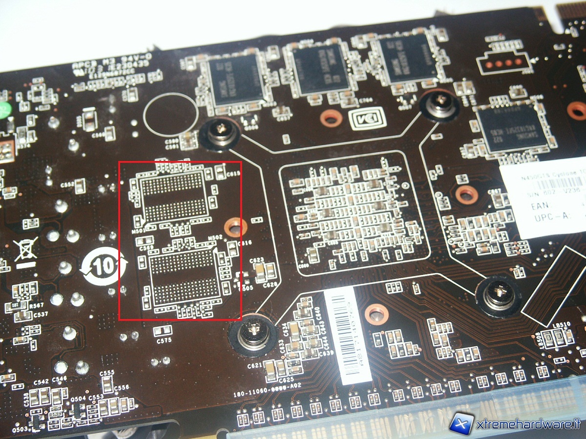 Un particolare che salta all’occhio, osservando da vicino la scheda, riguarda le ulteriori 4 predisposizioni per moduli di memoria GDDR5, due per lato, portando a 12 il numero totale di moduli implementabili on-board. Questo potrebbe far pensare che vi sia la possibilità, in un prossimo futuro, di vedere un GF106 con tutti e 3 i Memory Controller attivi e quindi bus a 192bit, con dotazione di memoria di 768MB oppure 1.536MB, a seconda dei moduli impiegati.