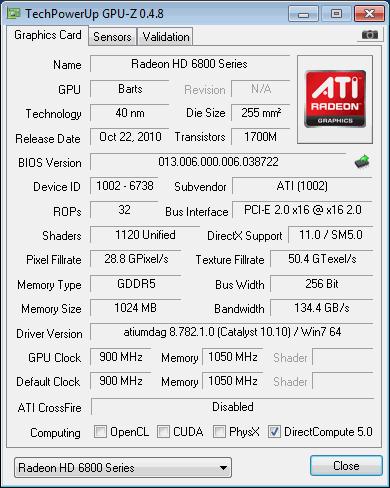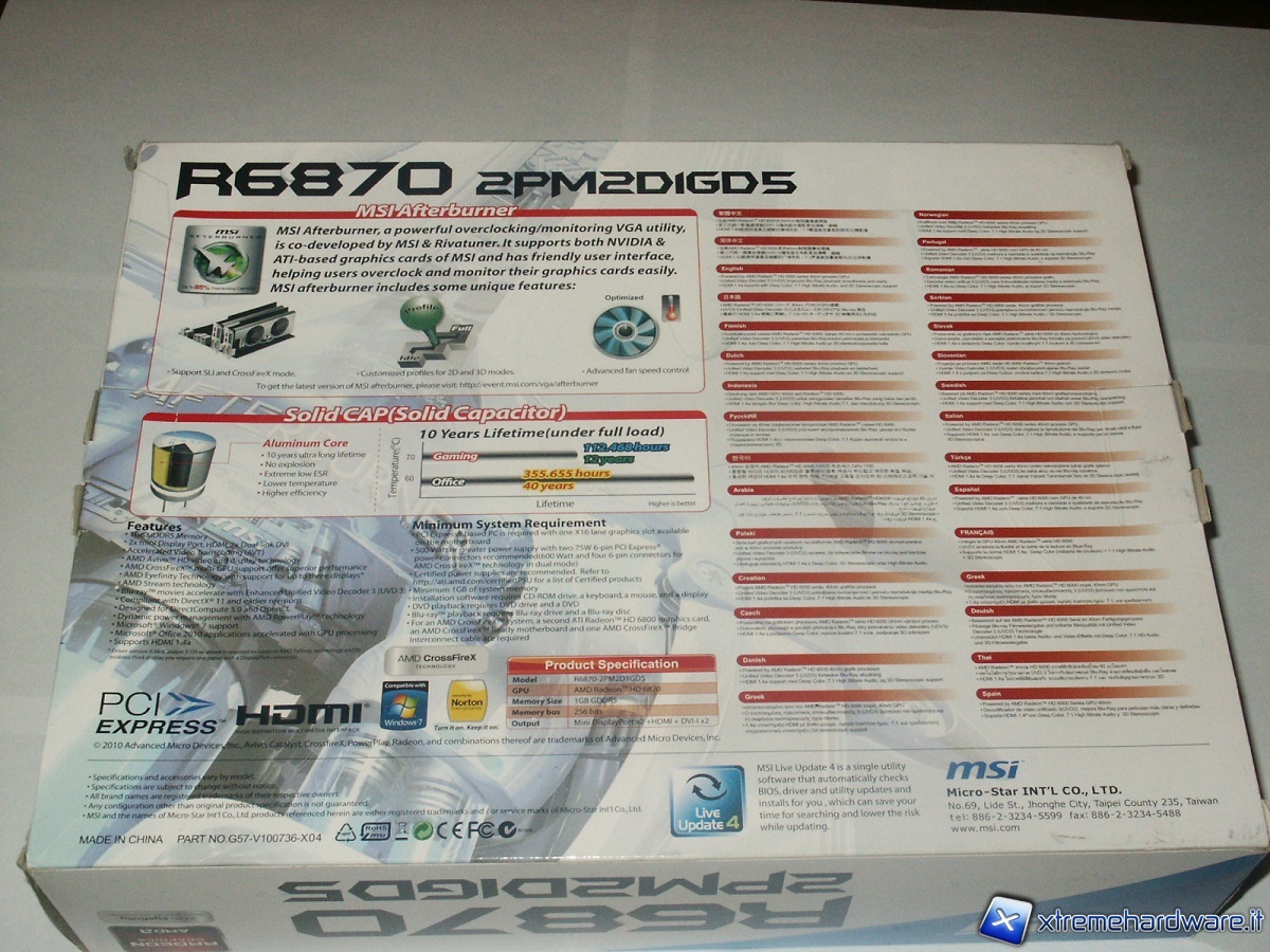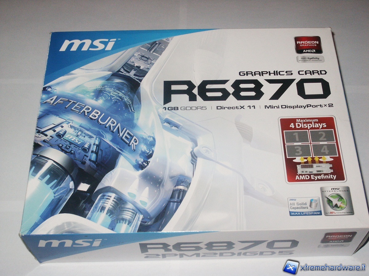 La scheda è giunta in redazione all’interno della confezione originale prevista da MSI. La GPU “Barts XT”, prevede tutte le 14 unità SIMD attive e di conseguenza, troviamo ben 1120 Stream Processor, ottanta per ogni SIMD. L’interfaccia verso la memoria è a 256bit con pieno supporto alle GDDR5. La frequenza di funzionamento dei moduli è fissata a 1050MHz (4200MHz GDDR5) mentre la GPU opera a ben 900MHz. Questi valori permettono di ottenere una potenza computazionale molto elevata, pari a 2.0TFLOPS.