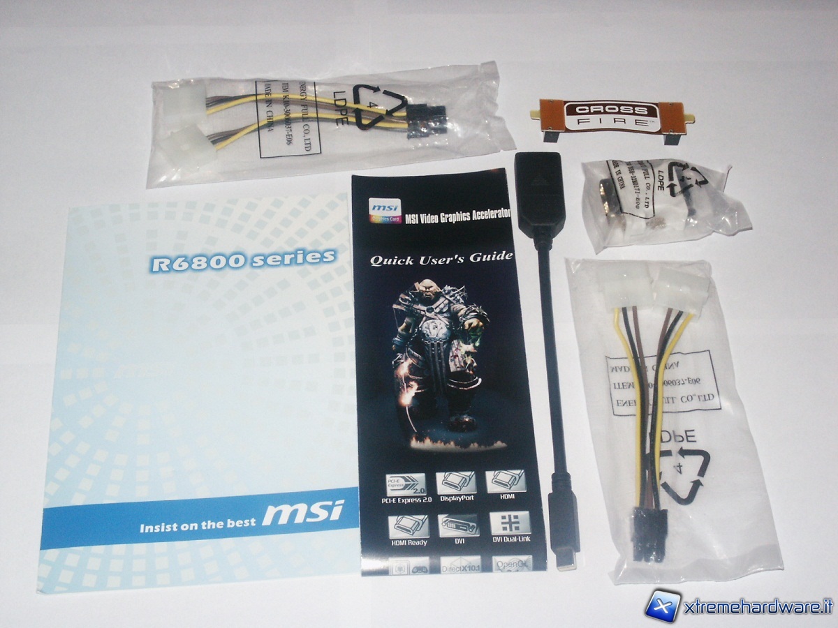 All’interno troviamo un’ulteriore scatola di cartone contenente il bundle e la scheda, ben protetta da materiale anti-urto. Il bundle comprende tutto il necessario, tra cui manuale e guida utente, un adattatore DVI to VGA, un adattatore Mini DP to Display Port, due adattatori Molex/PCIe 6pin e un bridge CrossFireX.