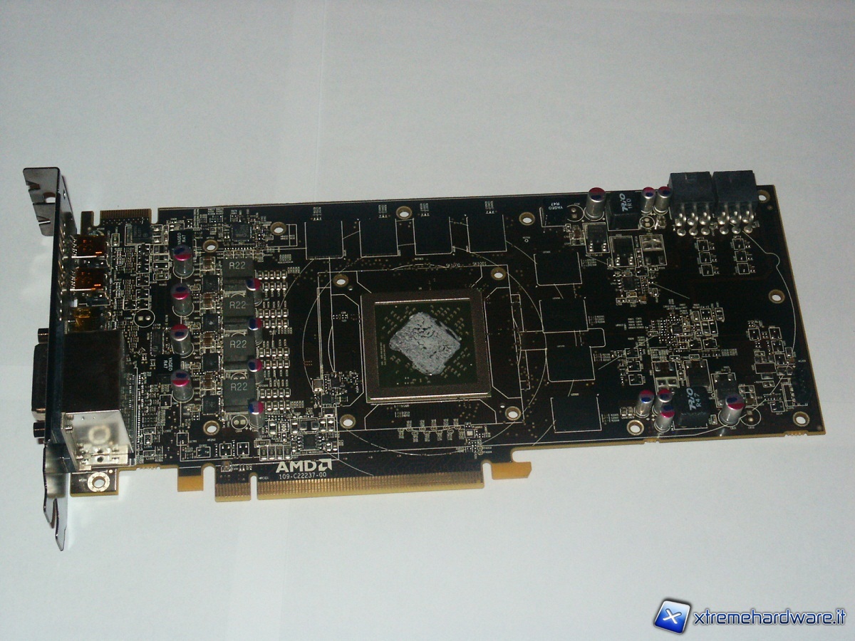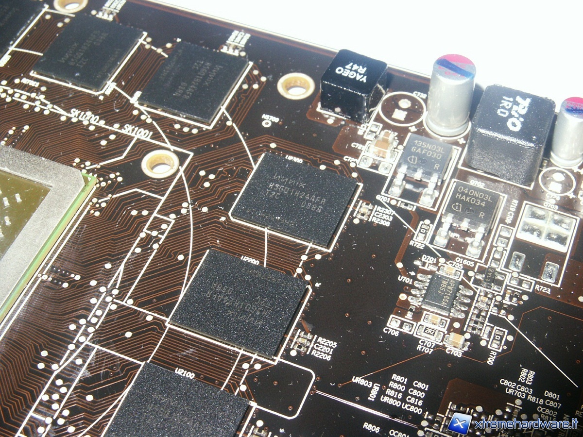 Una volta rimosso il dissipatore originale è possibile ammirare il PCB in tutto il suo splendore. Al centro spicca la GPU Barts XT, contornata dai moduli di memoria GDDR5. I componenti utilizzati sono di ottima qualità, come i condensatori, tutti allo stato solido.
